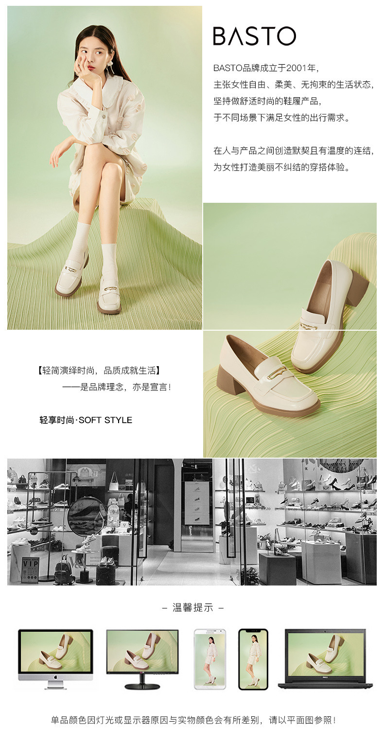 BASTO(百思图),品牌拥有17年历史,秉承优雅、甜美、清新的设计理念,主张“好嫁风”的产品风格,将甜美俏丽的少女情怀融合优雅气质的时尚品味,塑造出唯美优雅、受欢迎的女鞋款式。主打以女性温柔与亲和力为特色的流行时尚产品,糅合雅致又富有亲和力的裸粉色调,淑媛端庄、清新甜美。目前品牌已开设线下门店达1400多家。