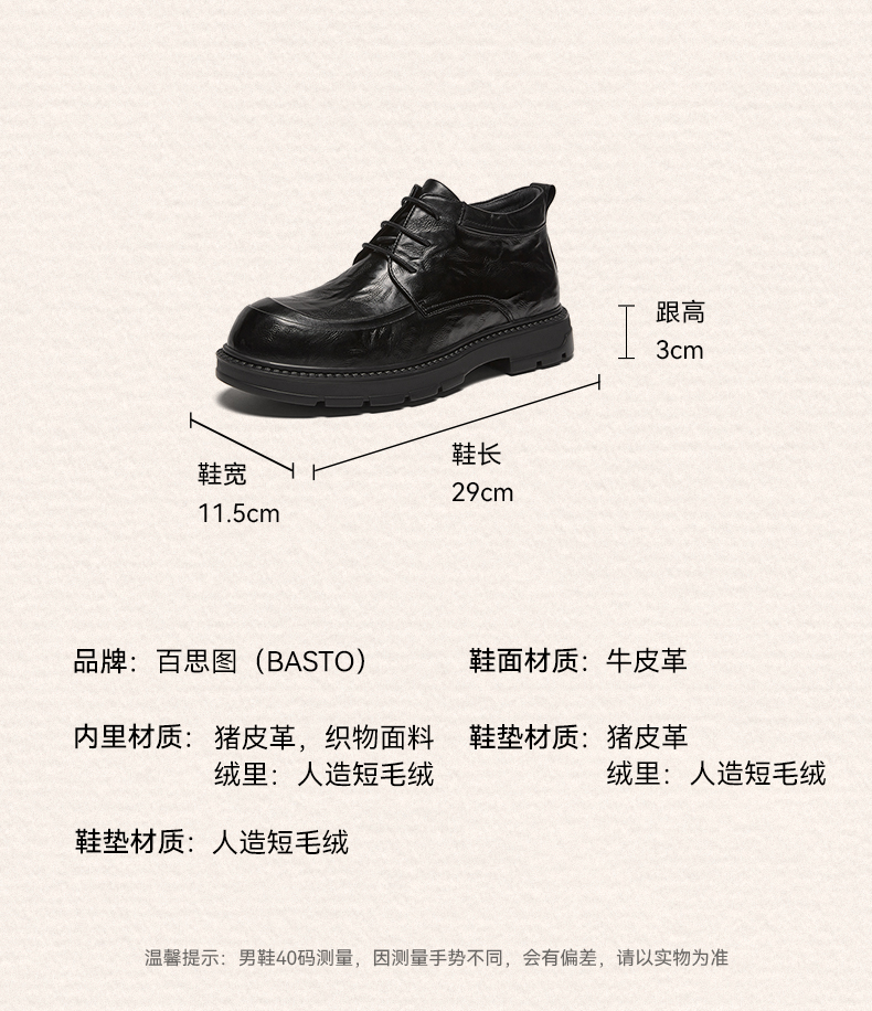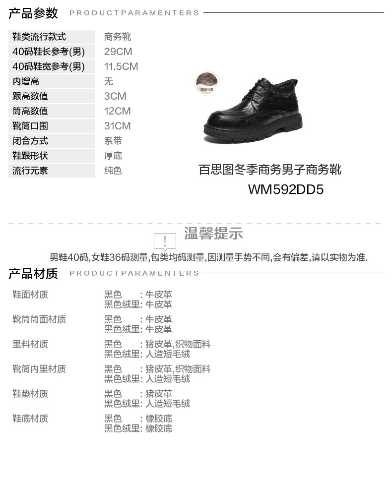 | 闭合方式:系带 | 40码鞋宽参考(男):11.5CM | 靴筒口围:31CM | 上市时间:2025年冬季 | 鞋类流行款式:商务靴 |
