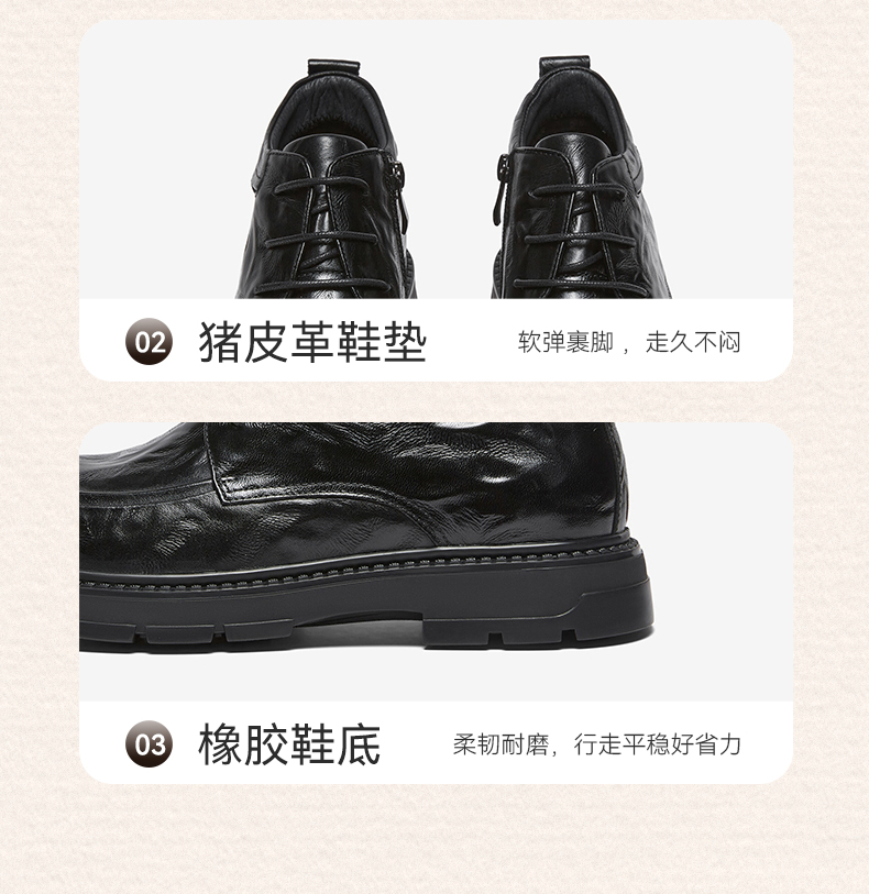 | 40码鞋长参考(男):29CM | 鞋底材质:橡胶底 | 靴筒内里材质:织物面料猪皮革 | 内增高:无 | 鞋面材质:牛皮革 |
