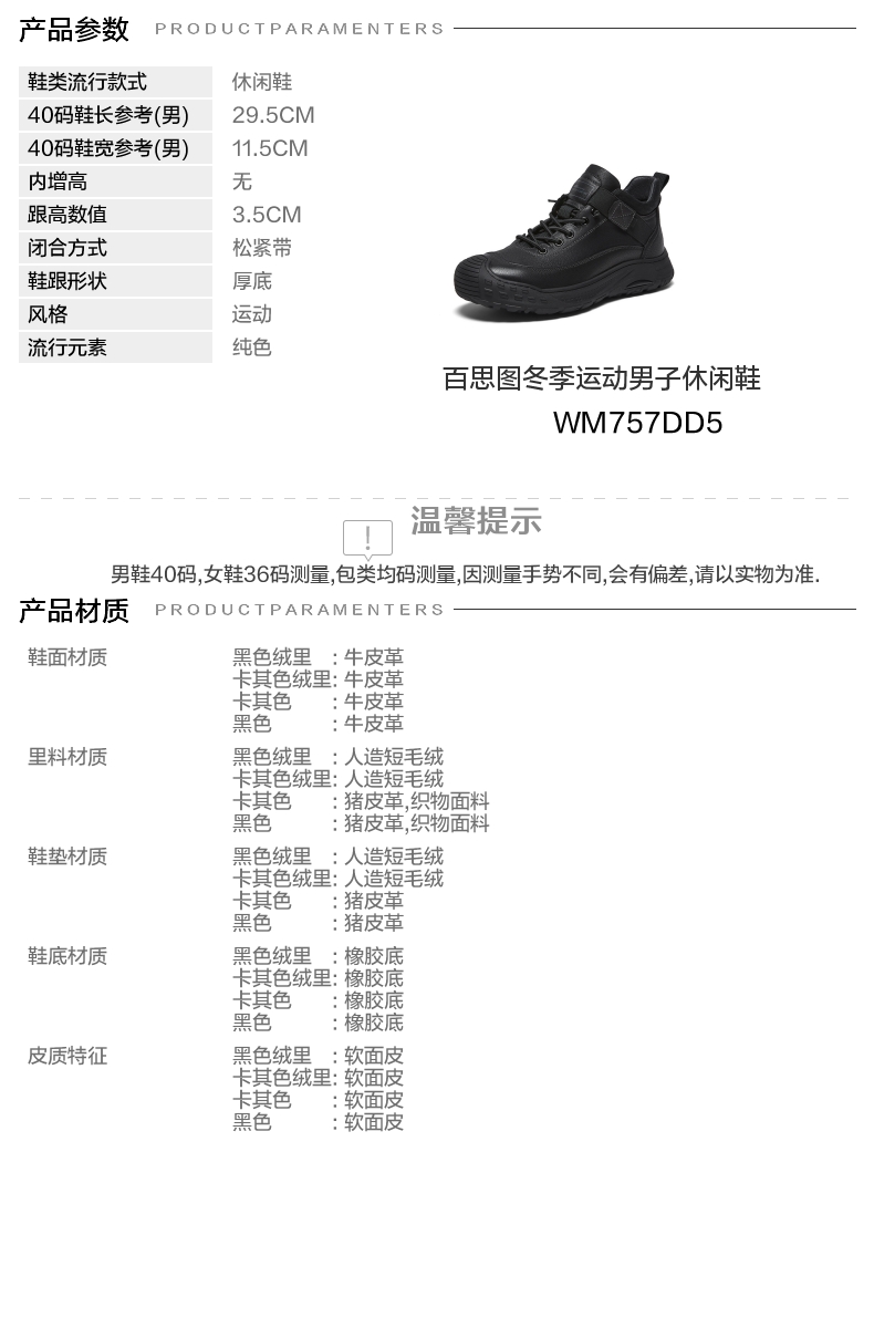 | 风格:运动 | 色系:黑色 | 跟高数值:3.5CM | 40码鞋宽参考(男):11.5CM | 筒高数值:13CM |