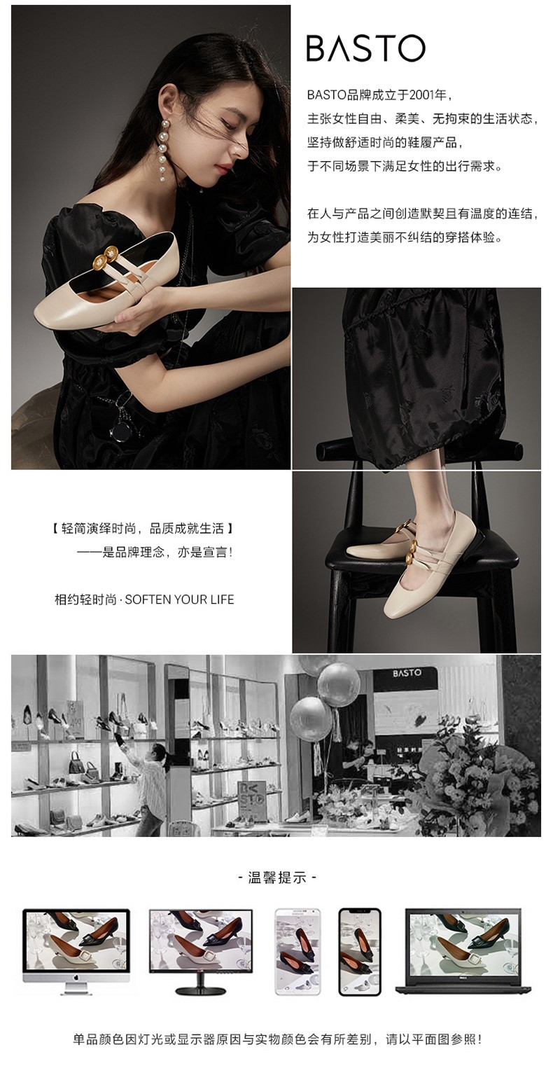 BASTO(百思图),品牌拥有17年历史,秉承优雅、甜美、清新的设计理念,主张“好嫁风”的产品风格,将甜美俏丽的少女情怀融合优雅气质的时尚品味,塑造出唯美优雅、受欢迎的女鞋款式。主打以女性温柔与亲和力为特色的流行时尚产品,糅合雅致又富有亲和力的裸粉色调,淑媛端庄、清新甜美。目前品牌已开设线下门店达1400多家。