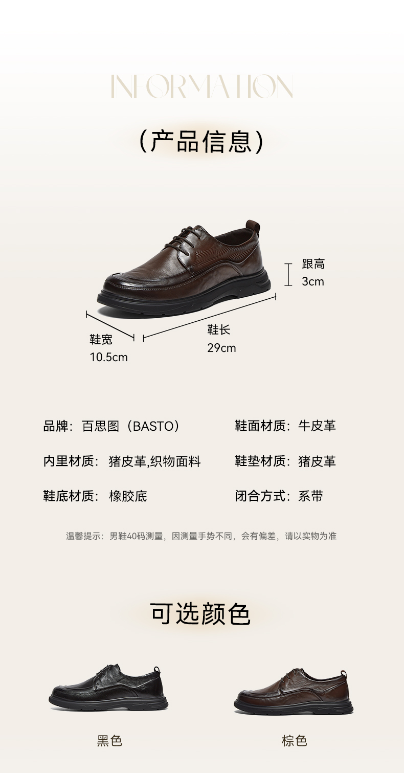 | 风格:商务 | 色系:棕色 | 跟高数值:3CM | 40码鞋宽参考(男):10.5CM | 性别:男子 |