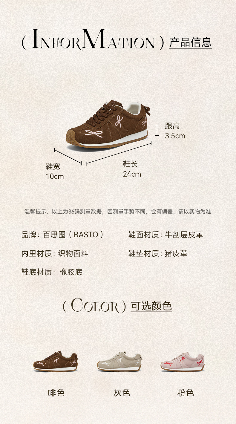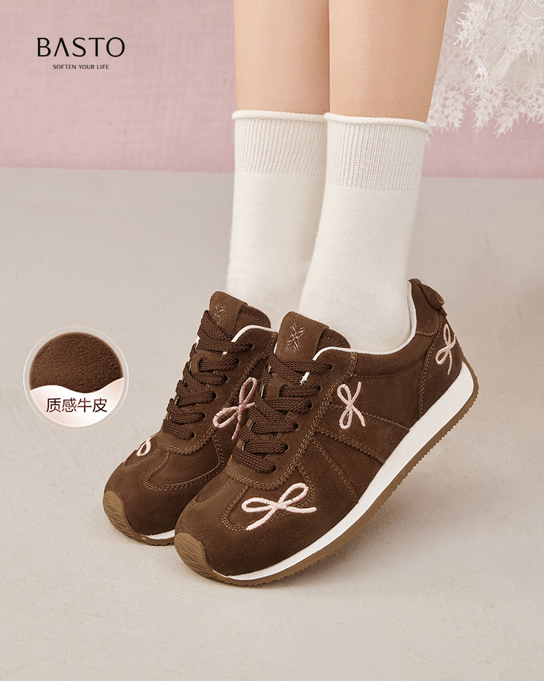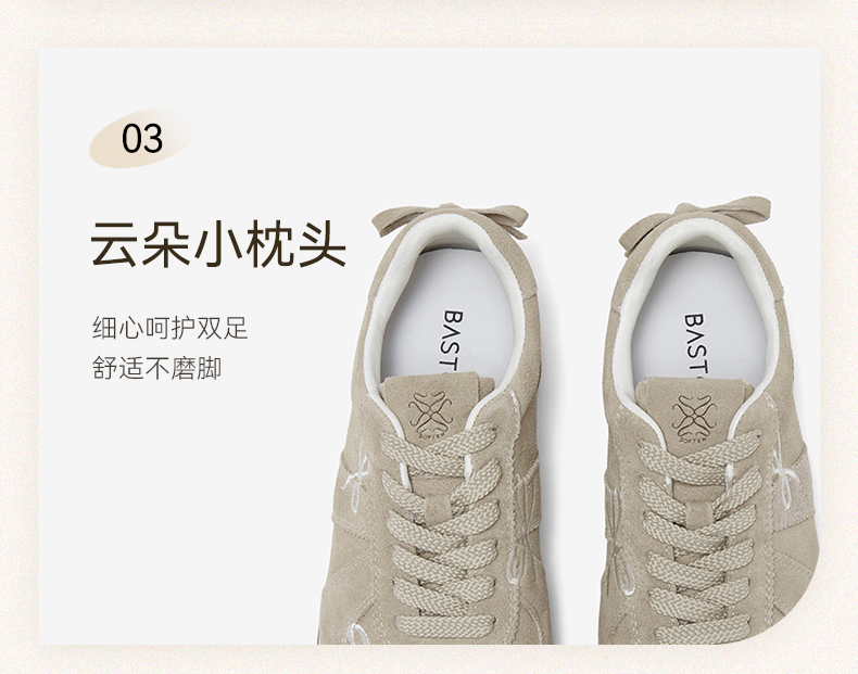 BASTO(百思图),品牌拥有17年历史,秉承优雅、甜美、清新的设计理念,主张“好嫁风”的产品风格,将甜美俏丽的少女情怀融合优雅气质的时尚品味,塑造出唯美优雅、受欢迎的女鞋款式。主打以女性温柔与亲和力为特色的流行时尚产品,糅合雅致又富有亲和力的裸粉色调,淑媛端庄、清新甜美。目前品牌已开设线下门店达1400多家。
