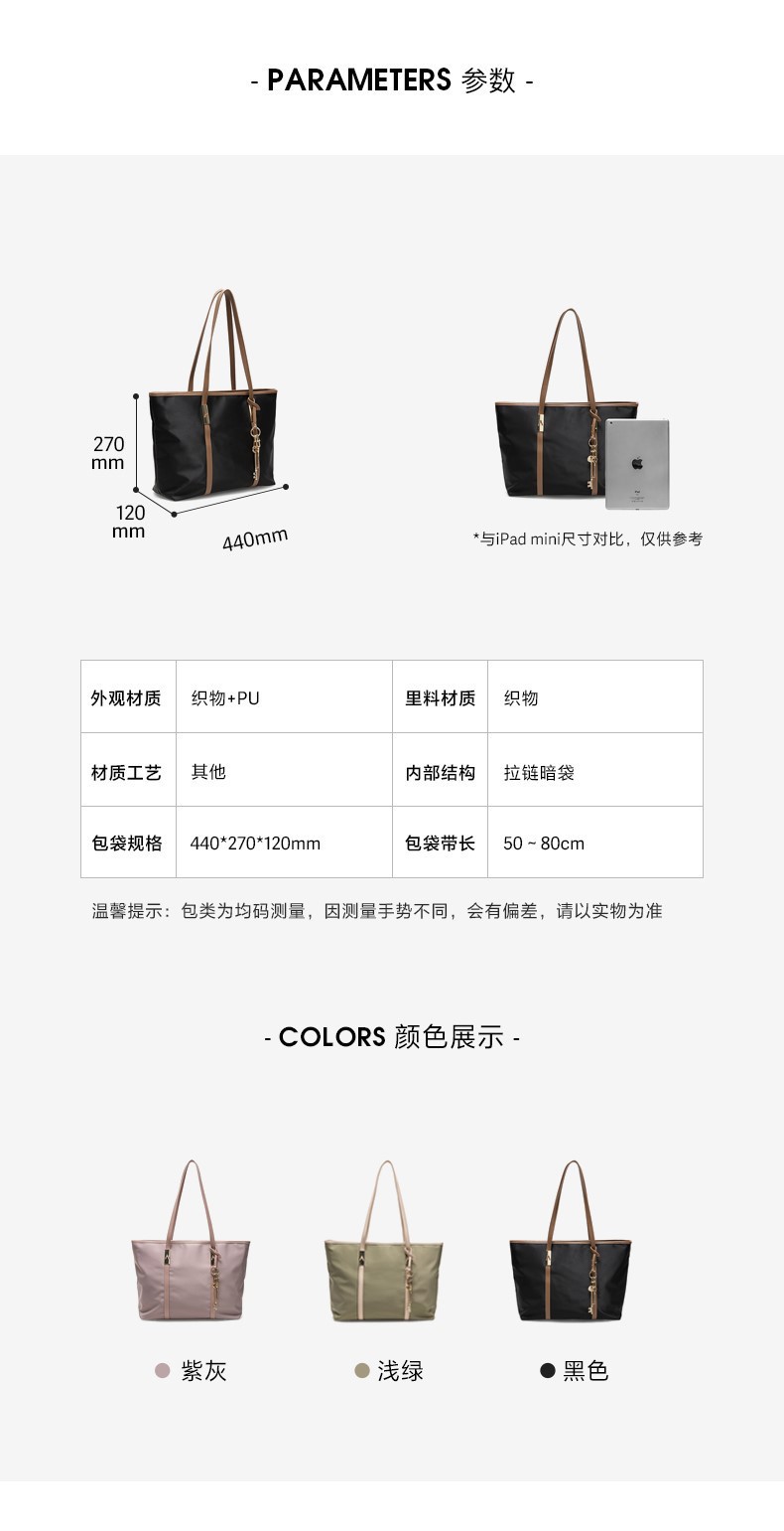 | 提拎部件类型:软把 | 手柄:无 | 可否折叠:否 | 闭合方式:拉链 | 货品来源:自产 |