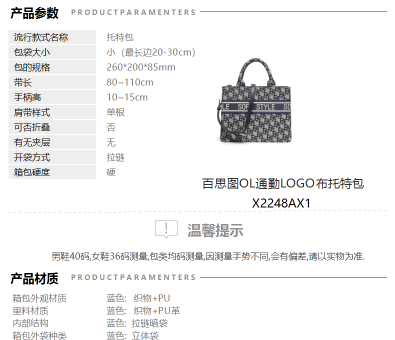 | 是否防水:否 | 里料材质:织物PU | 手柄高:10~15cm | 款式季节:春季 | 材质工艺:其他 |