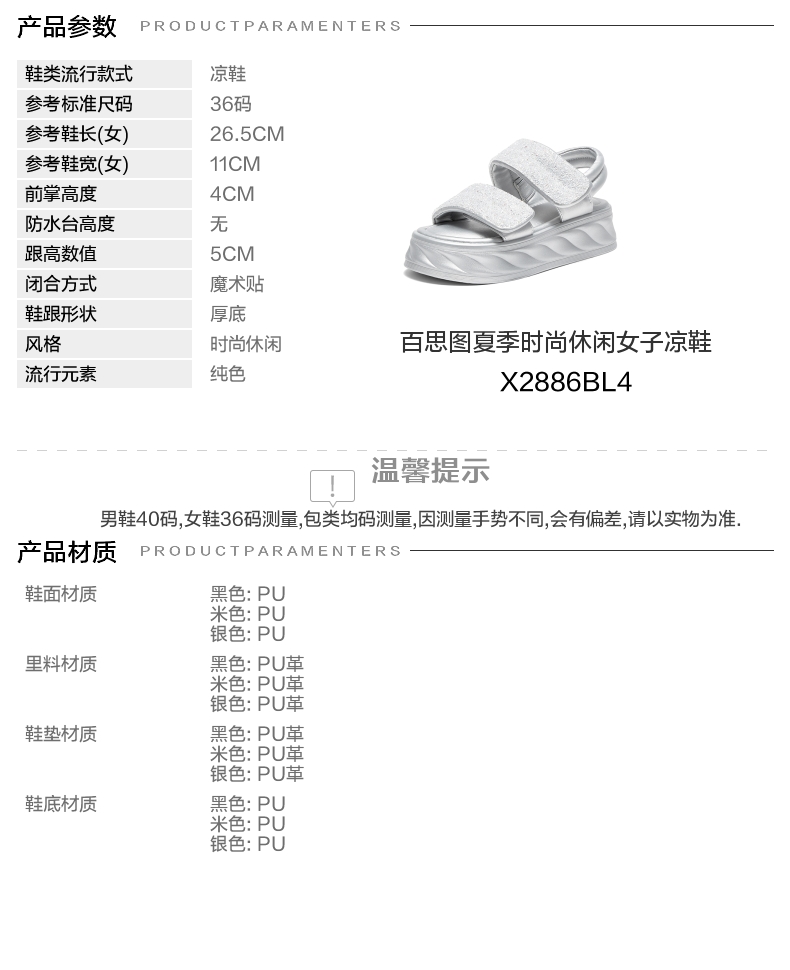 | 风格:时尚休闲 | 年份:2024年 | 色系:银色 | 参考标准尺码:36码 | 跟高数值:5CM |