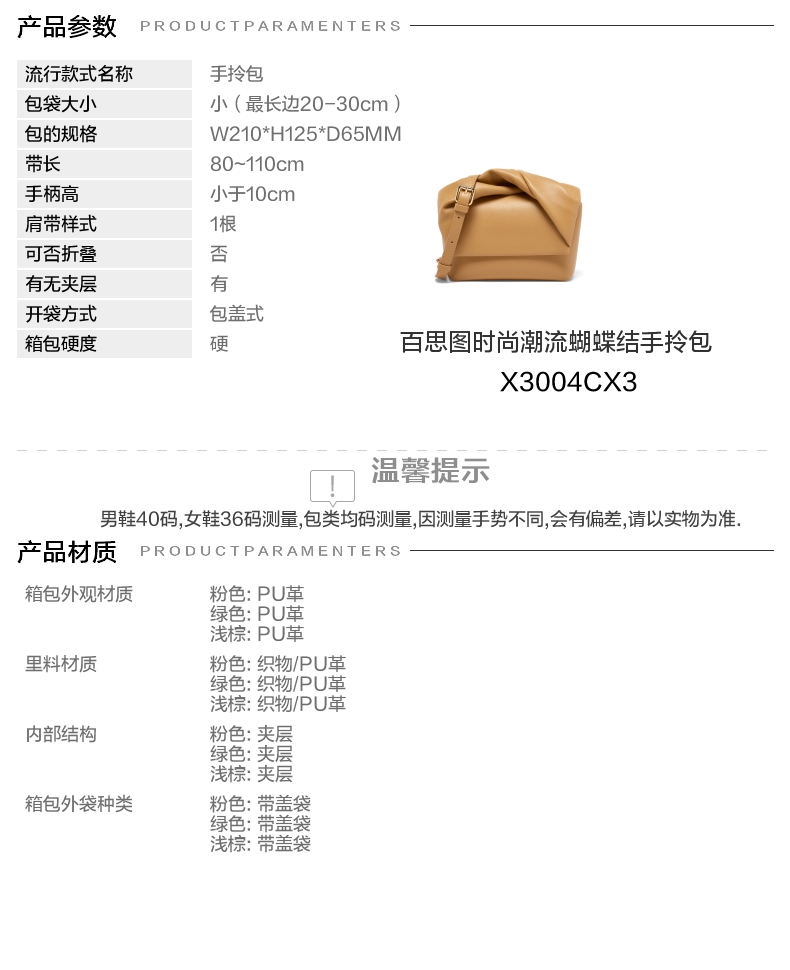 | 适用场景:通勤 | 开袋方式:包盖式 | 性别:女子 | 手柄高:小于10cm | 里料材质:织物/PU革 |