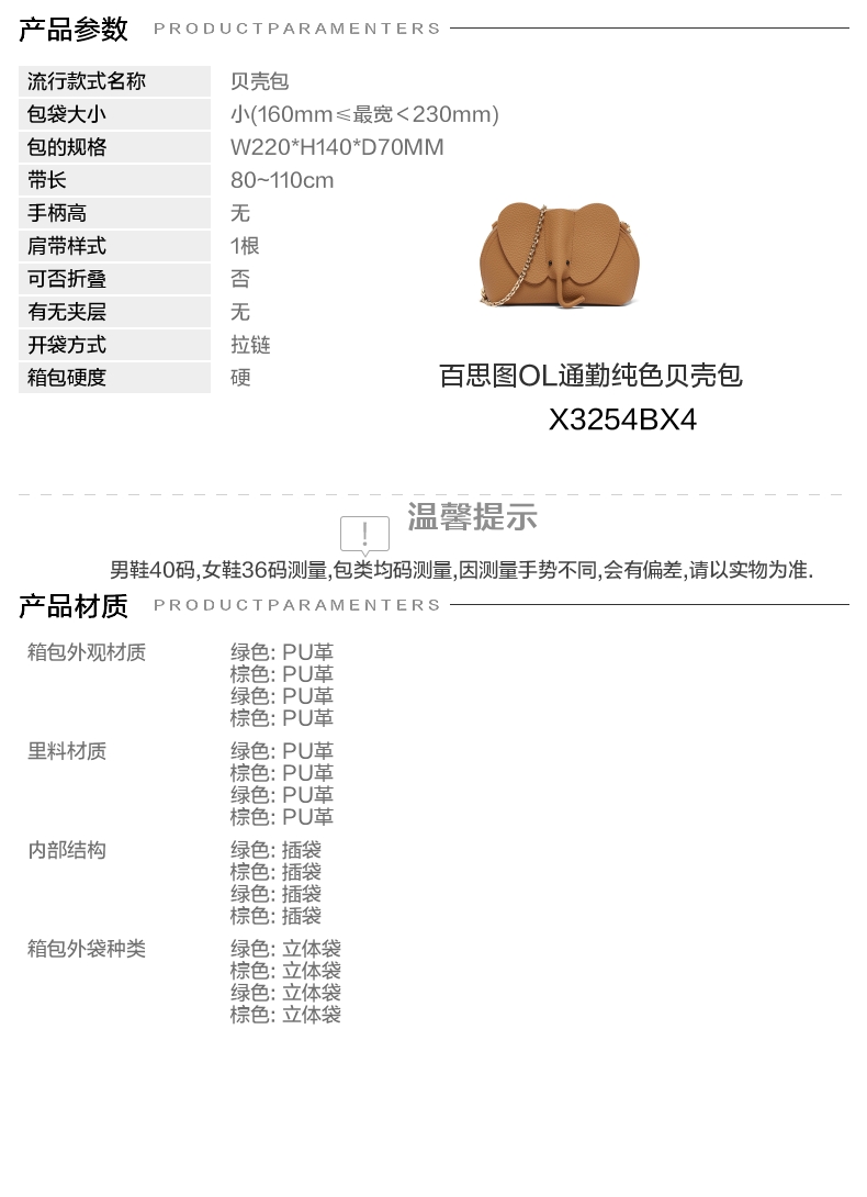 | 年份:2024年 | 色系:棕色 | 适用场景:通勤 | 流行款式名称:贝壳包 | 开袋方式:拉链 |