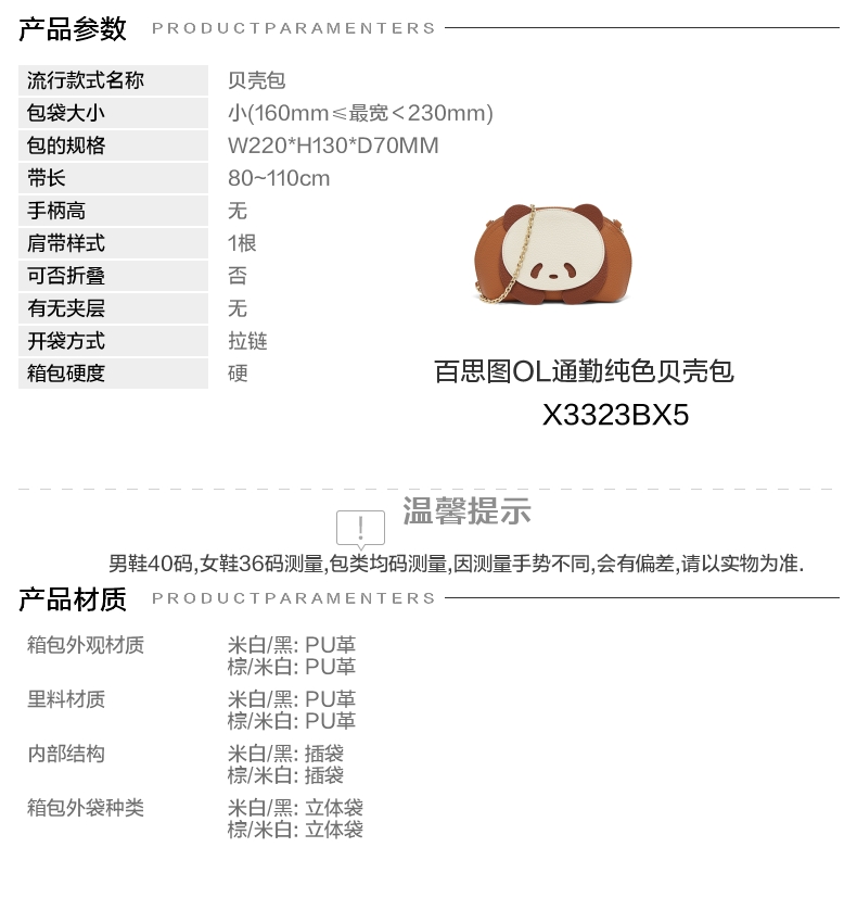 | 适用场景:通勤 | 开袋方式:拉链 | 性别:女子 | 手柄高:无 | 里料材质:PU革 |