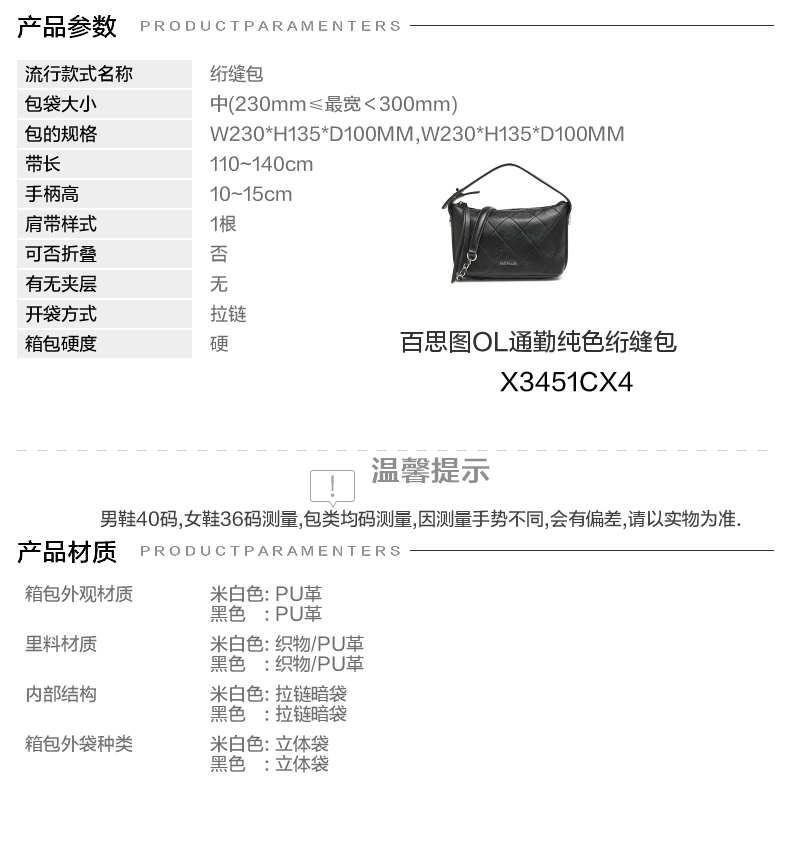 | 材质工艺:PU | 渠道划分:线下同步 | 皮质特征:PU | 箱包外观材质:PU革 | 箱包硬度:硬 |