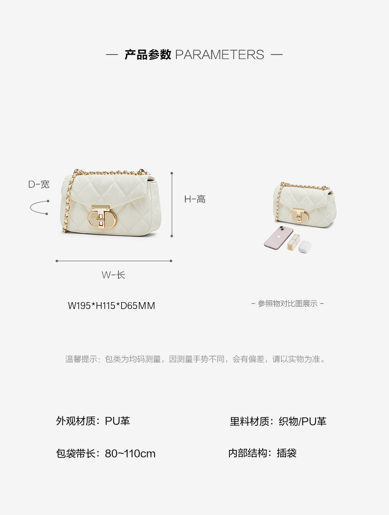| 包的规格:W195*H115*D65MMW195*H115*D65MM | 内部结构:插袋 | 背带方式:单肩/斜挎 | 风格:OL通勤 | 色系:米白 |