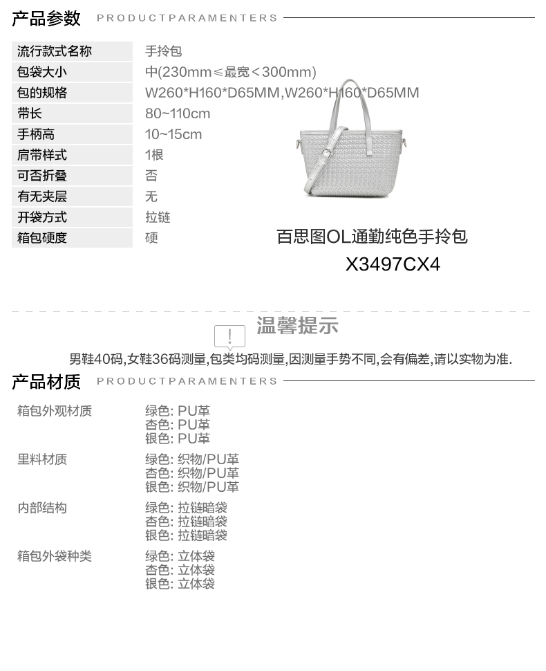 | 年份:2024年 | 色系:银色 | 适用场景:通勤 | 流行款式名称:手拎包 | 开袋方式:拉链 |
