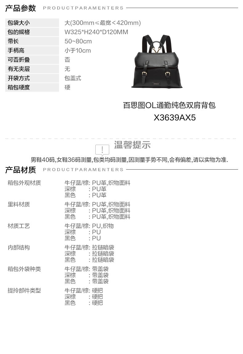 | 款式季节:春季 | 材质工艺:PU | 渠道划分:线下同步 | 皮质特征:PU | 箱包外观材质:PU革 |