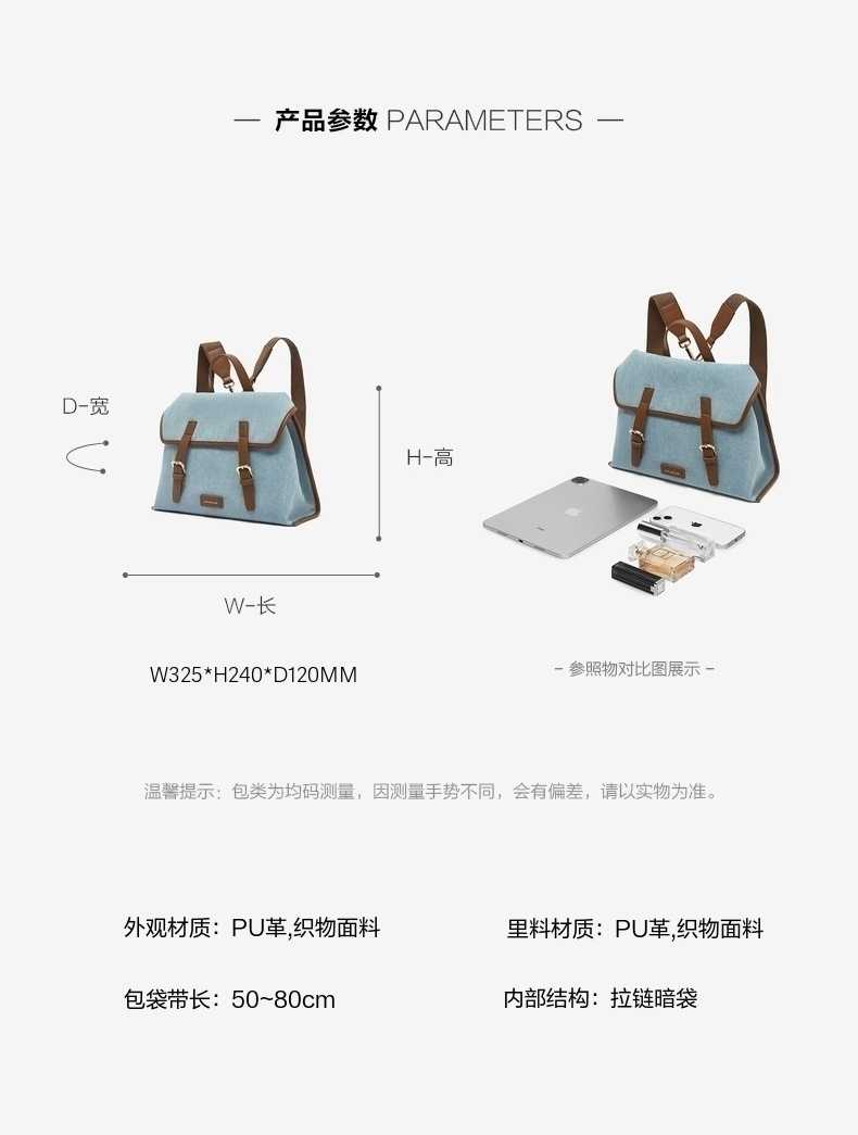 | 流行元素:纯色 | 包的规格:W325*H240*D120MM | 内部结构:拉链暗袋 | 背带方式:双肩 | 有无夹层:无 |