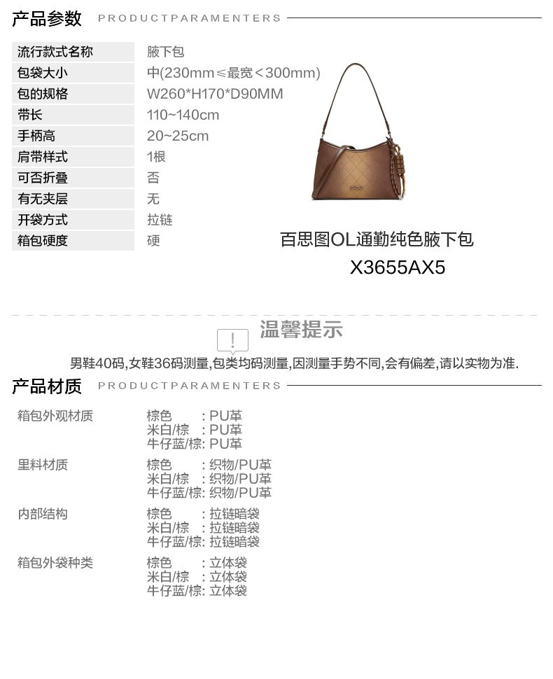 | 款式季节:春季 | 材质工艺:PU | 渠道划分:线下同步 | 皮质特征:PU | 箱包外观材质:PU革 |