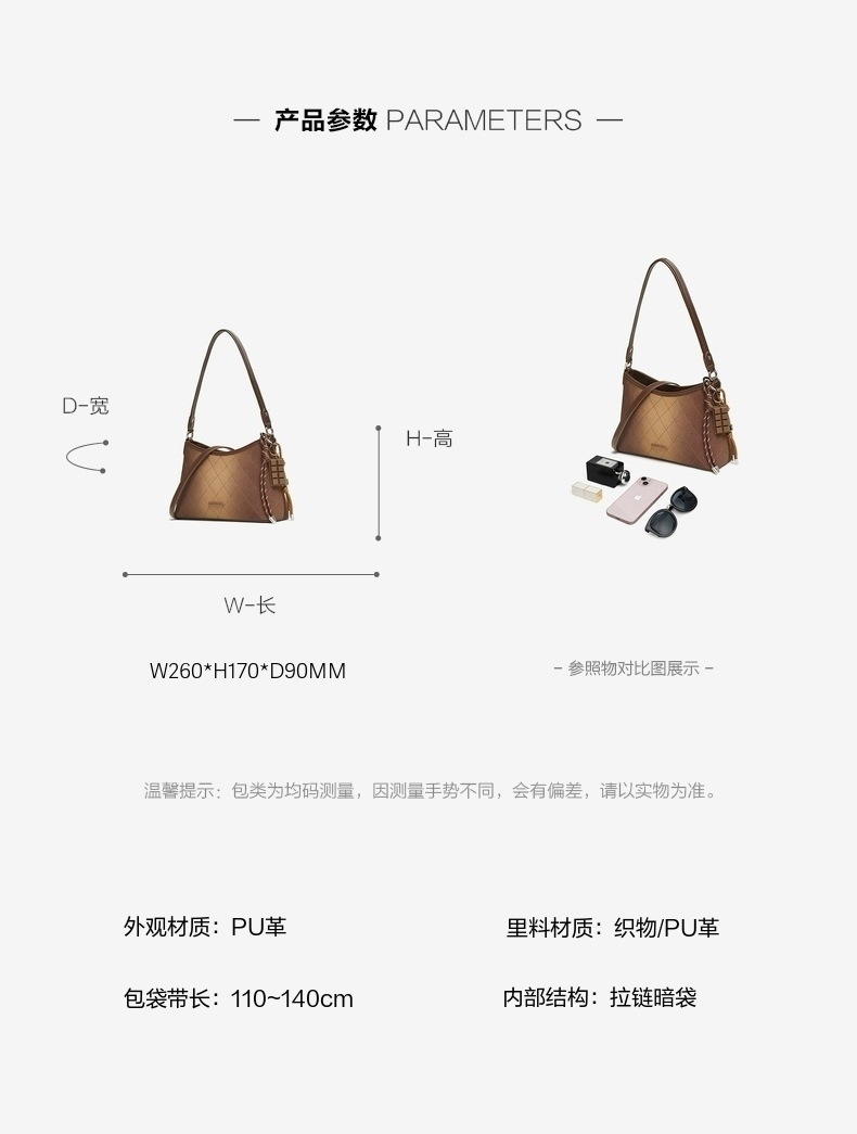 | 流行元素:纯色 | 包的规格:W260*H170*D90MM | 内部结构:拉链暗袋 | 背带方式:单肩/斜挎 | 有无夹层:无 |