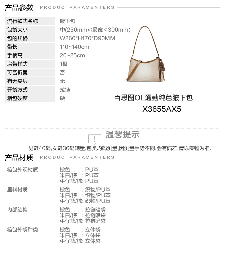 | 款式季节:春季 | 材质工艺:PU | 渠道划分:线下同步 | 皮质特征:PU | 箱包外观材质:PU革 |