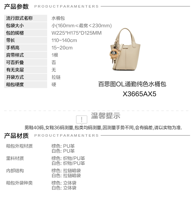 | 款式季节:春季 | 材质工艺:PU | 渠道划分:线下同步 | 皮质特征:PU | 箱包外观材质:PU革 |