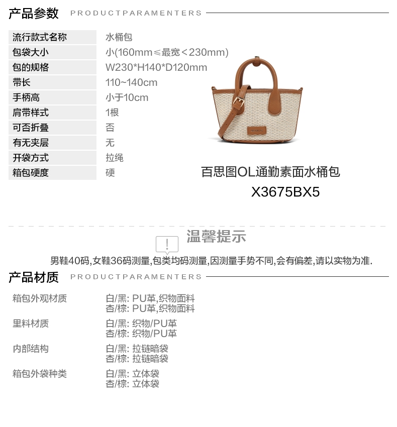 | 适用场景:通勤 | 开袋方式:拉绳 | 性别:女子 | 手柄高:小于10cm | 里料材质:织物/PU革 |