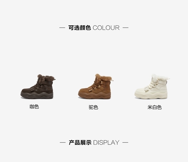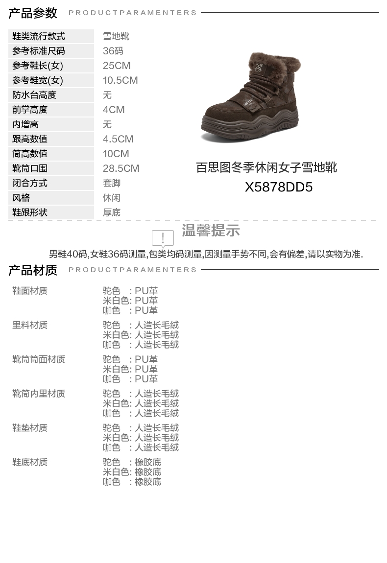 | 参考鞋宽(女):10.5CM | 风格:休闲 | 鞋面内里材质:人造长毛绒 | 色系:咖啡色 | 跟高数值:4.5CM |
