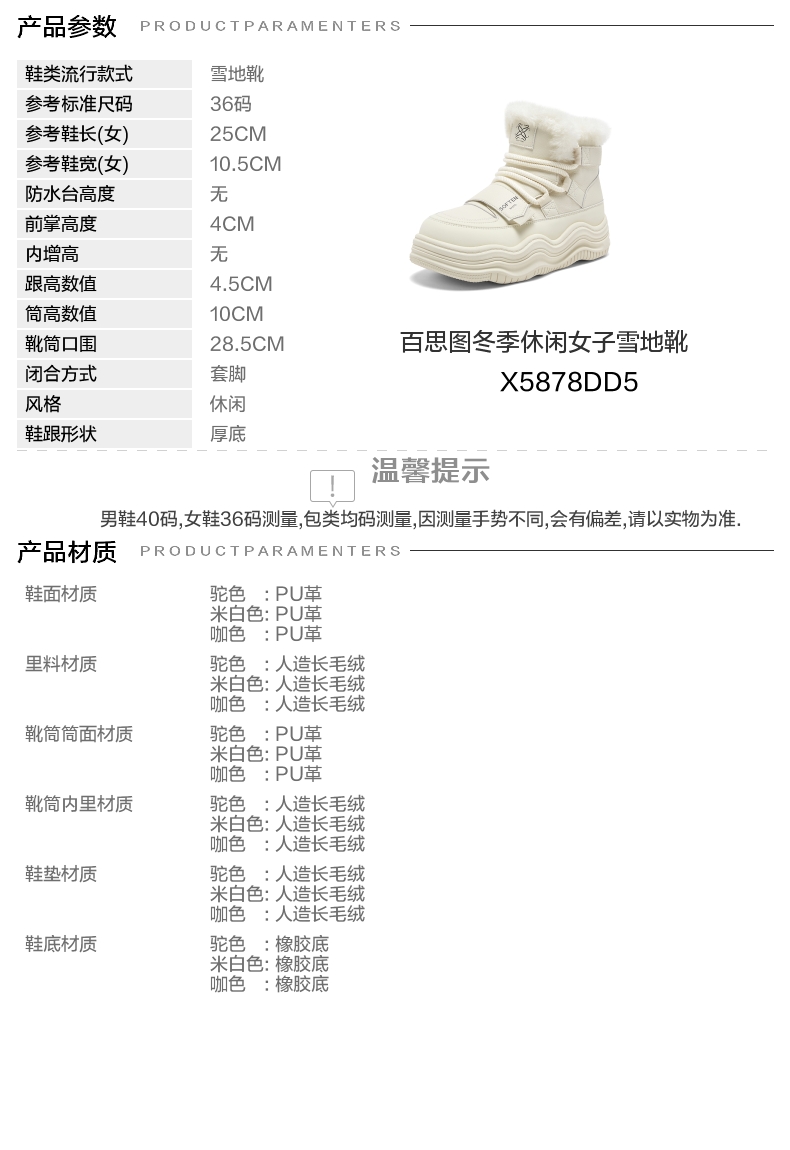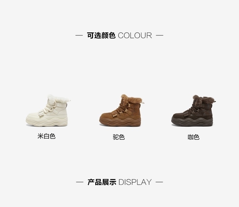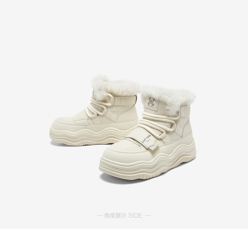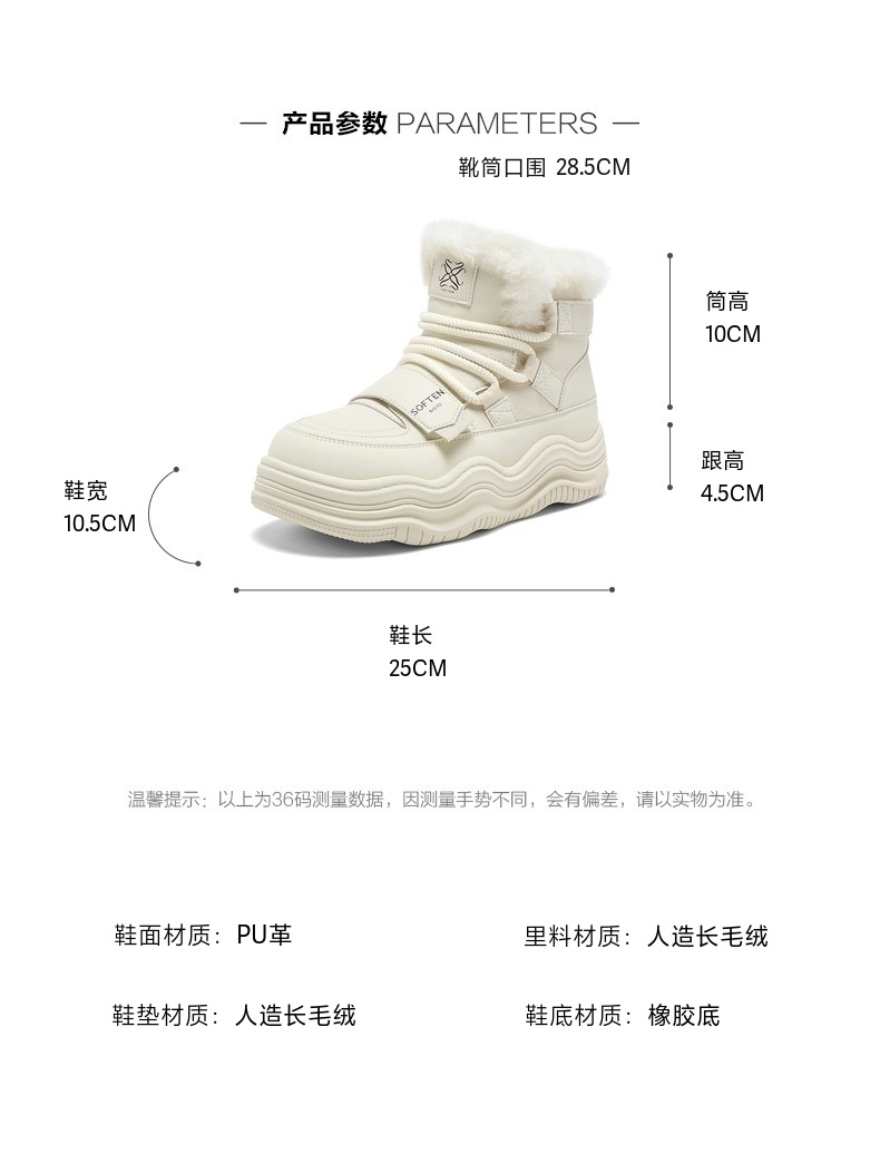 | 参考鞋宽(女):10.5CM | 风格:休闲 | 鞋面内里材质:人造长毛绒 | 色系:白色 | 跟高数值:4.5CM |