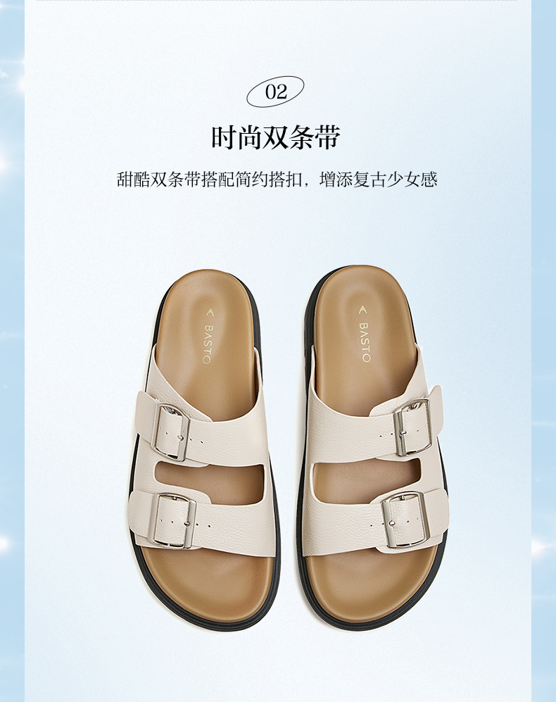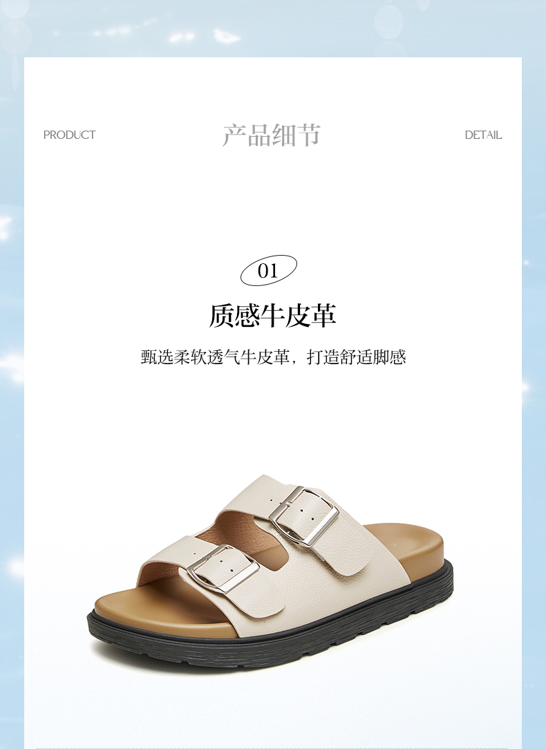 | 渠道划分:电商专销 | 前掌高度:2CM | 皮质特征:牛皮革 | 防水台高度:无 | 销售季:2024年夏季 |