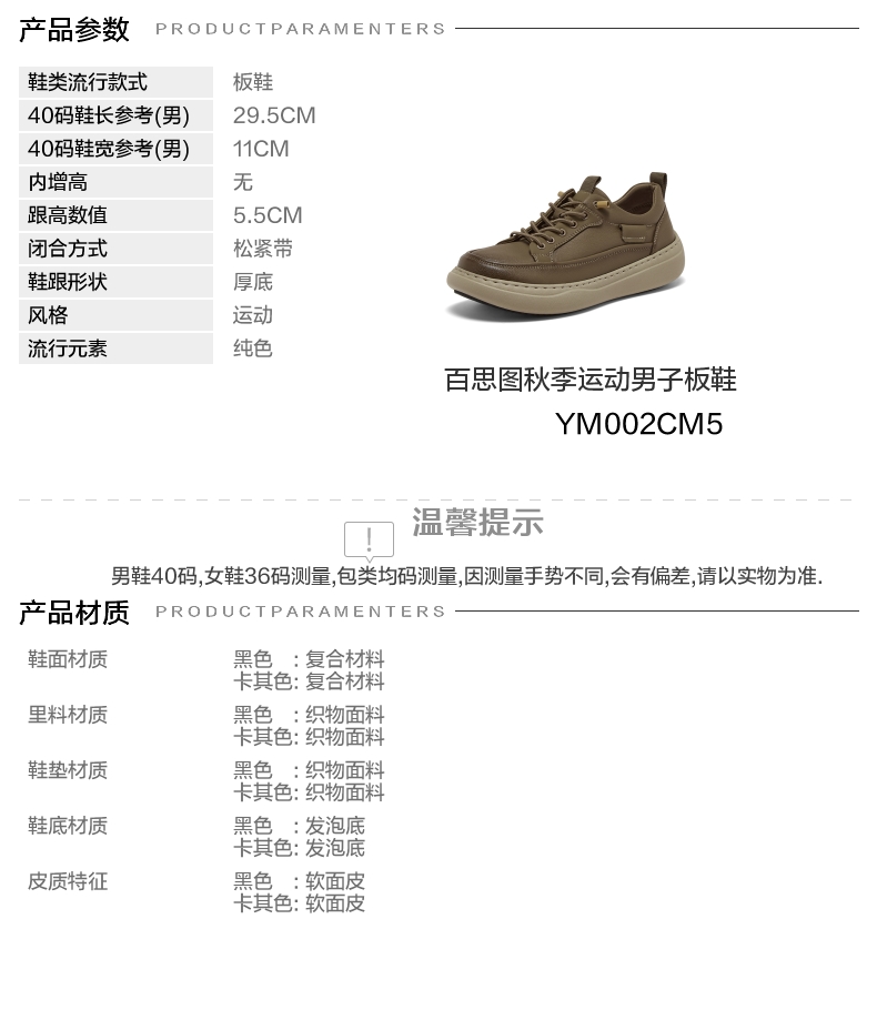 | 风格:运动 | 色系:卡其 | 跟高数值:5.5CM | 40码鞋宽参考(男):11CM | 性别:男子 |
