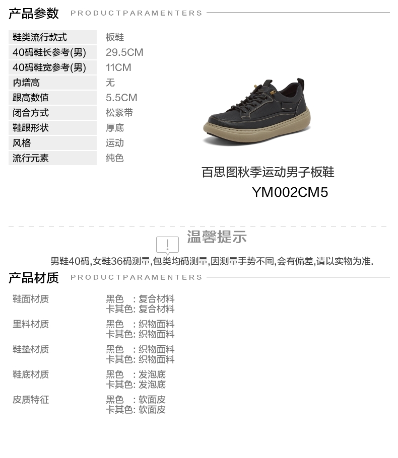 | 风格:运动 | 色系:黑色 | 跟高数值:5.5CM | 40码鞋宽参考(男):11CM | 性别:男子 |