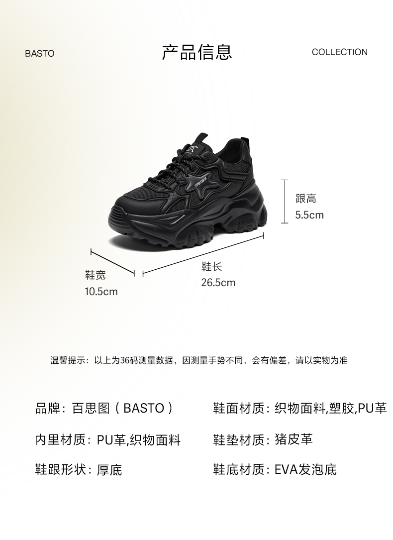 | 执行标准:舒适运动鞋Q/LR002-2023 | 跟高范围:中跟鞋(3-5CM) | 鞋面图案:纯色 | 鞋跟形状:厚底 | 厂家地址:广东省深圳市 |