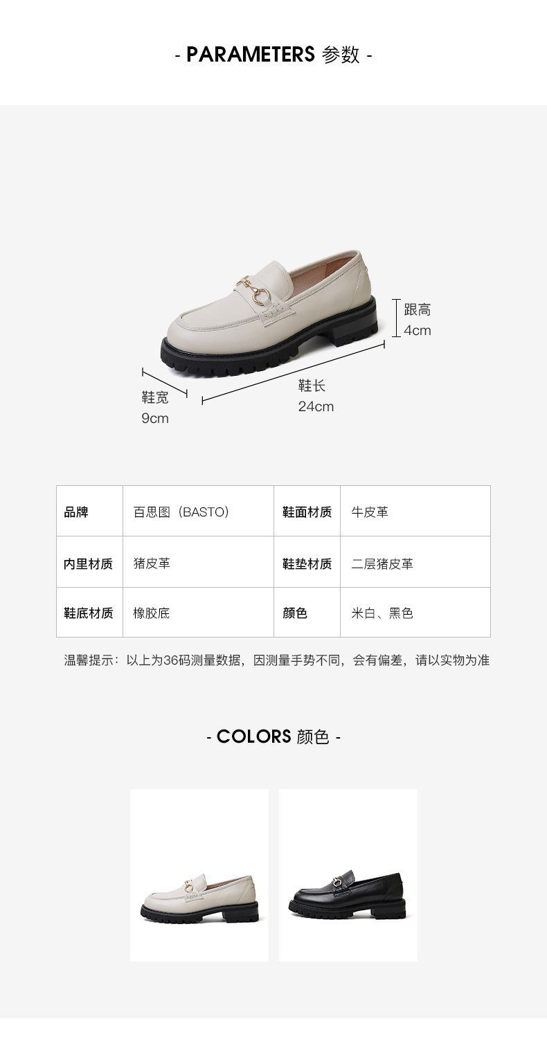 | 鞋底材质:橡胶底 | 内增高:无 | 鞋面材质:牛皮革 | 适用场合:约会办公室日常休闲 | 闭合方式:套脚 |