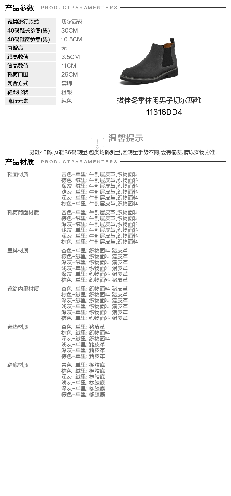 | 色系:棕色 | 跟高数值:3.5CM | 筒高数值:11CM | 性别:男子 | 靴筒筒面材质:牛剖层皮革织物面料 |