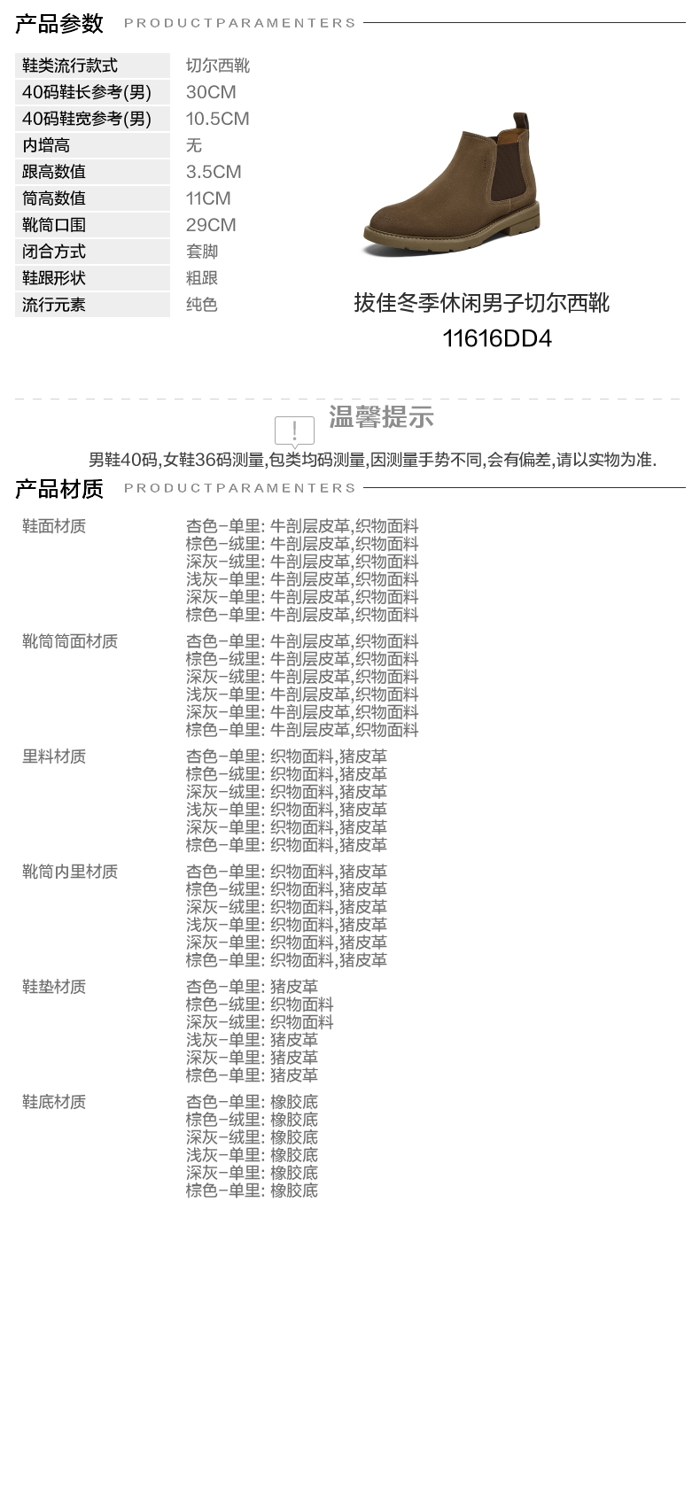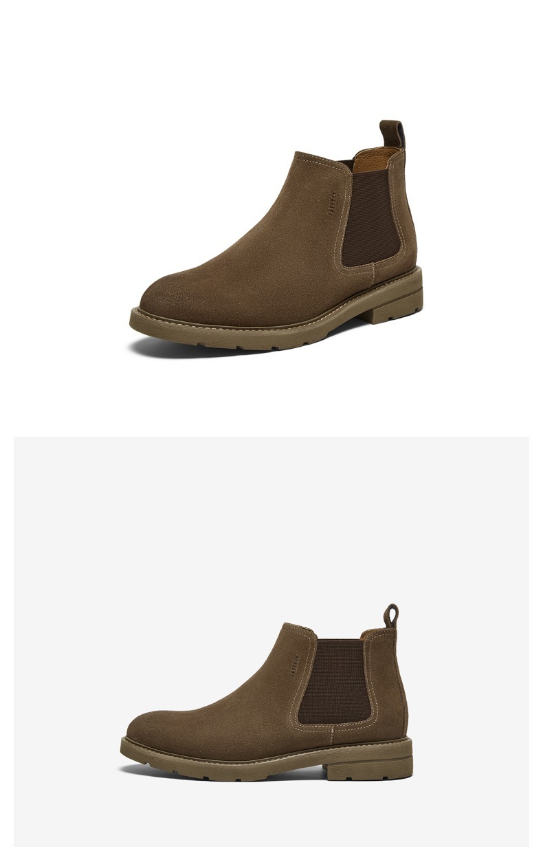 | 色系:棕色 | 跟高数值:3.5CM | 筒高数值:11CM | 性别:男子 | 靴筒筒面材质:织物面料牛剖层皮革 |