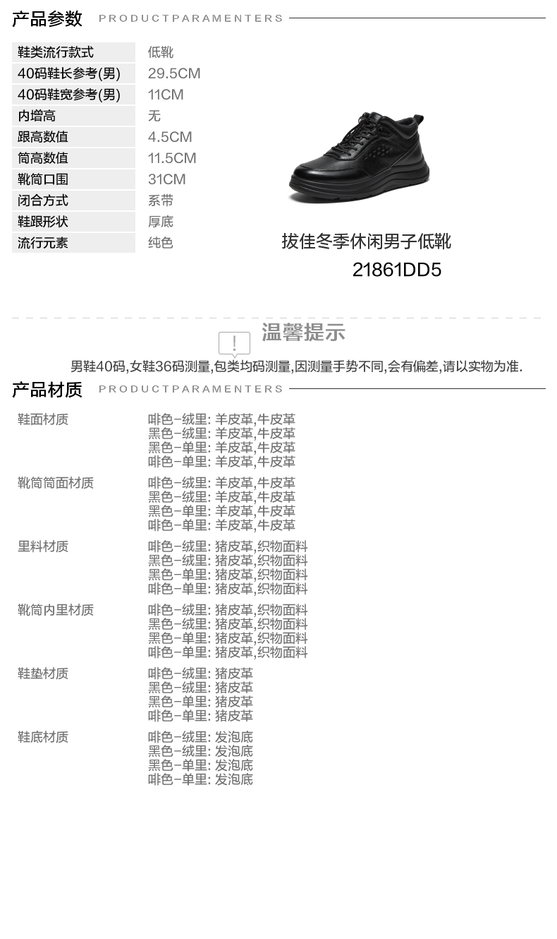 | 闭合方式:系带 | 40码鞋宽参考(男):11CM | 靴筒口围:31CM | 上市时间:2025年冬季 | 鞋类流行款式:低靴 |