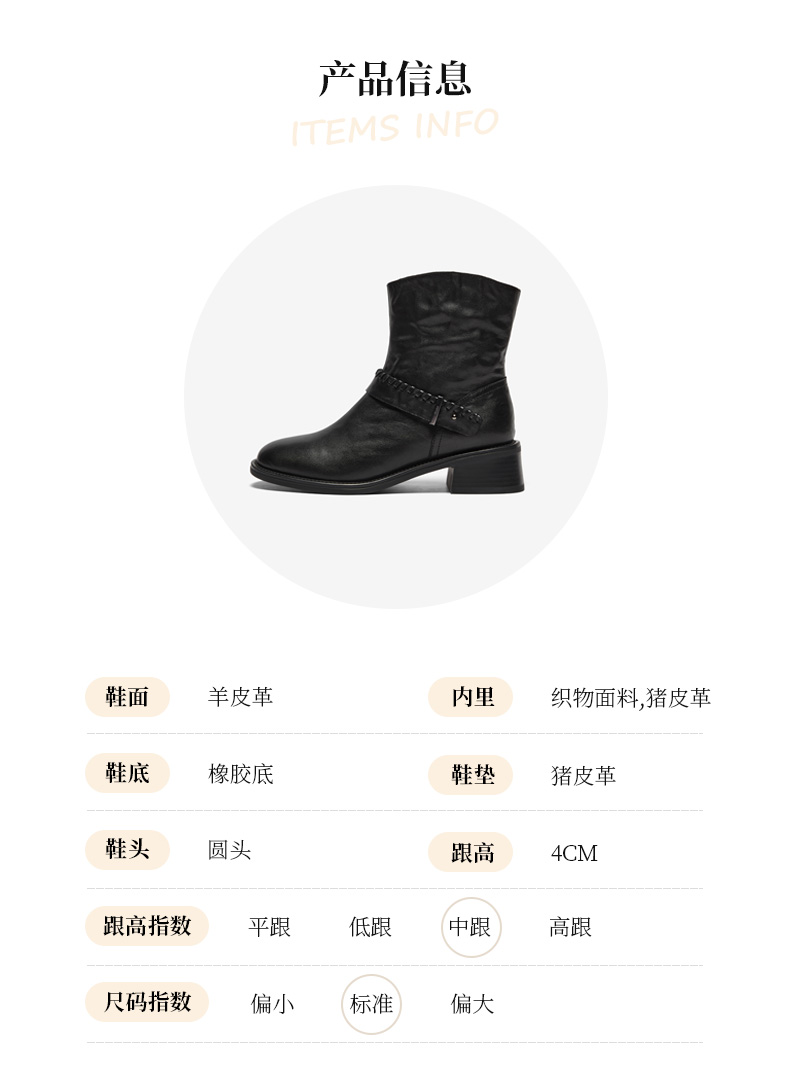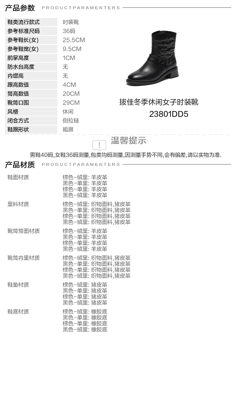 | 鞋底材质:橡胶底 | 靴筒内里材质:猪皮革织物面料 | 内增高:无 | 鞋面材质:羊皮革 | 闭合方式:侧拉链 |