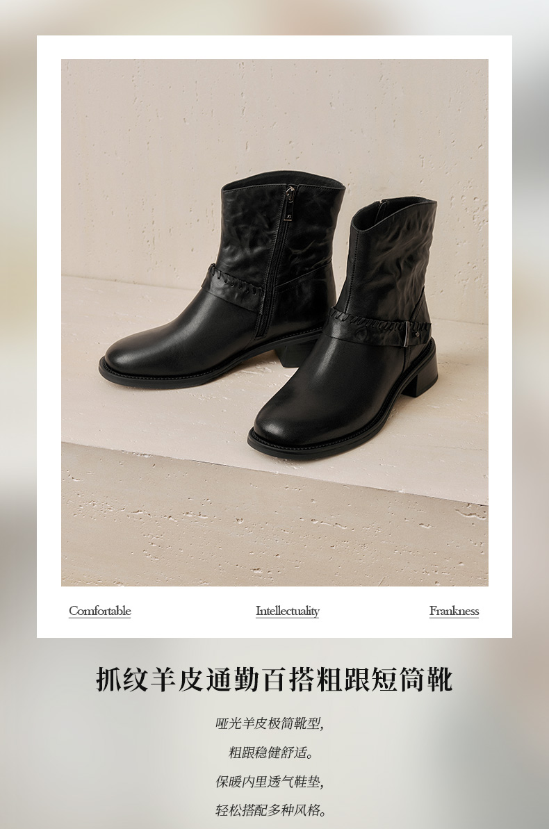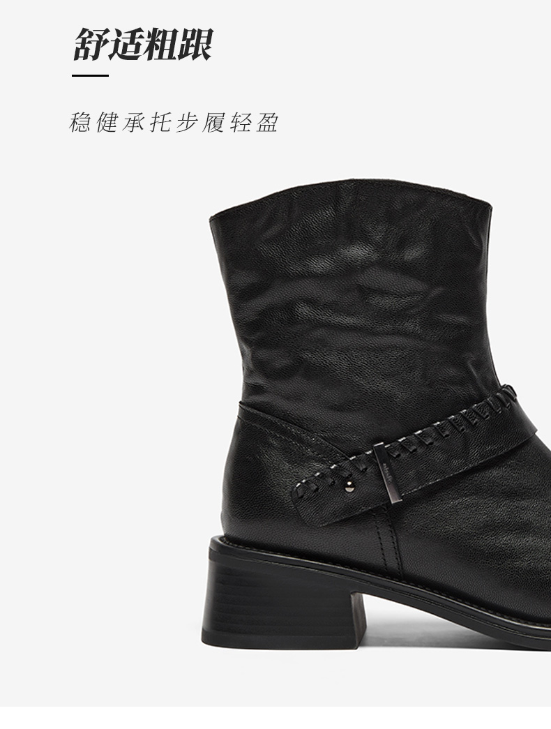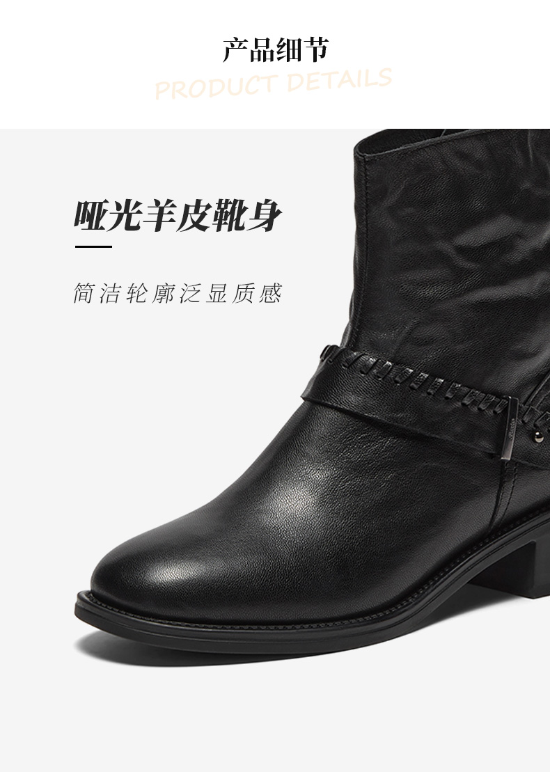 鞋底材质:橡胶底 靴筒内里材质:织物面料猪皮革 内增高:无 鞋面材质:羊皮革 闭合方式:侧拉链