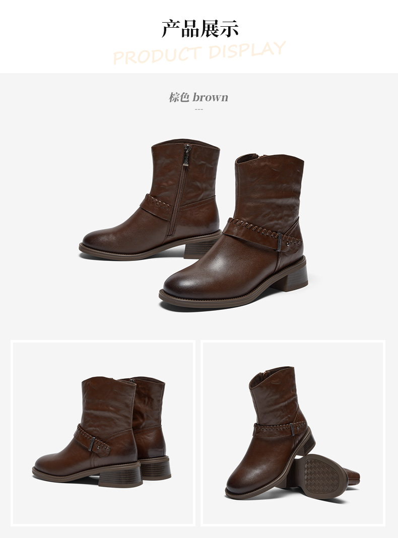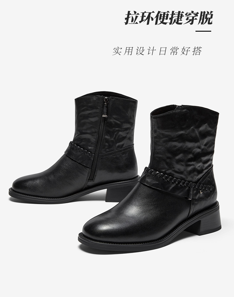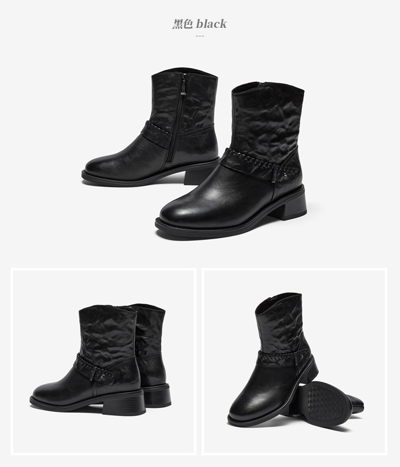 | 鞋底材质:橡胶底 | 靴筒内里材质:织物面料猪皮革 | 内增高:无 | 鞋面材质:羊皮革 | 闭合方式:侧拉链 |
