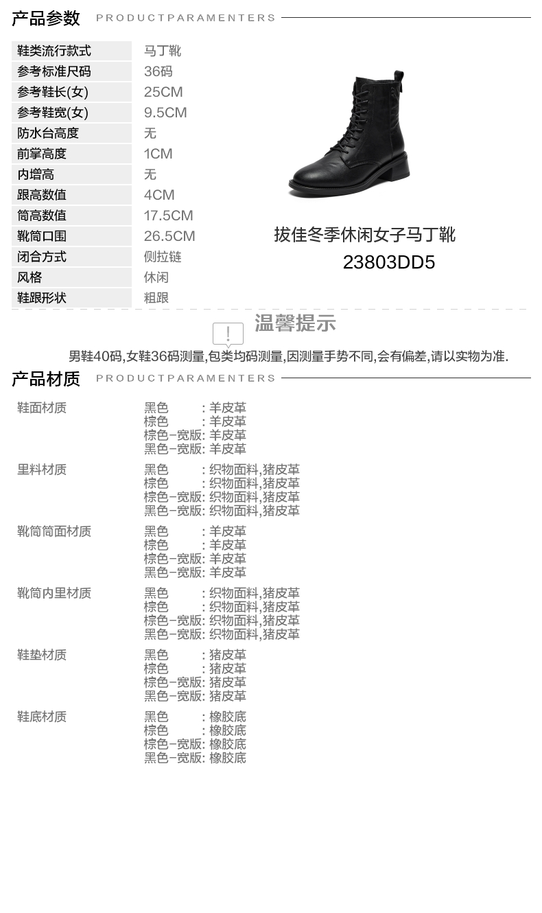 | 参考鞋宽(女):9.5CM | 风格:休闲 | 色系:黑色 | 跟高数值:4CM | 筒高数值:17.5CM |