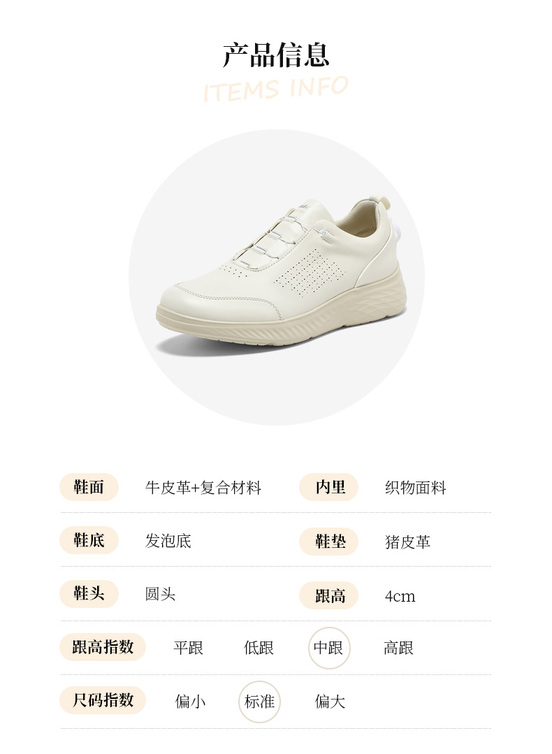 | 内增高:无 | 鞋跟形状:厚底 | 鞋面材质:复合材料牛皮革 | 流行元素:纯色 | 闭合方式:松紧带 |