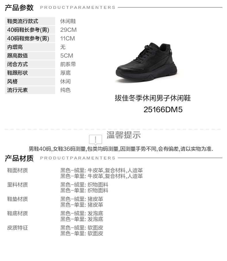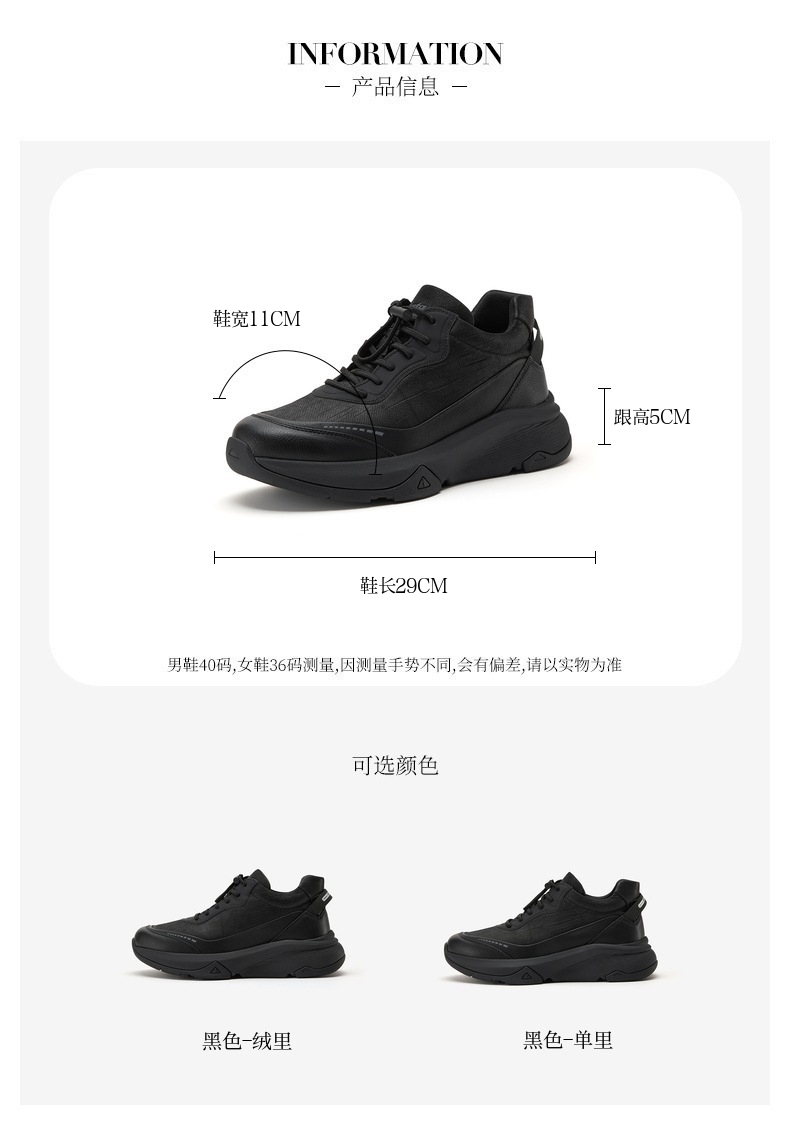 | 鞋面内里材质:猪皮革 | 色系:黑色 | 跟高数值:5CM | 40码鞋宽参考(男):11CM | 性别:男子 |