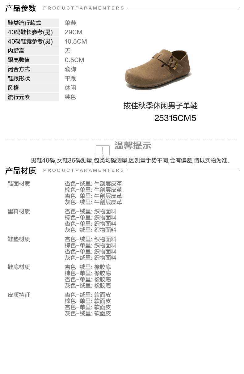 | 风格:休闲 | 色系:棕色 | 跟高数值:0.5CM | 40码鞋宽参考(男):10.5CM | 性别:男子 |