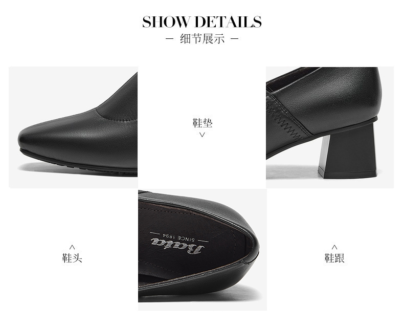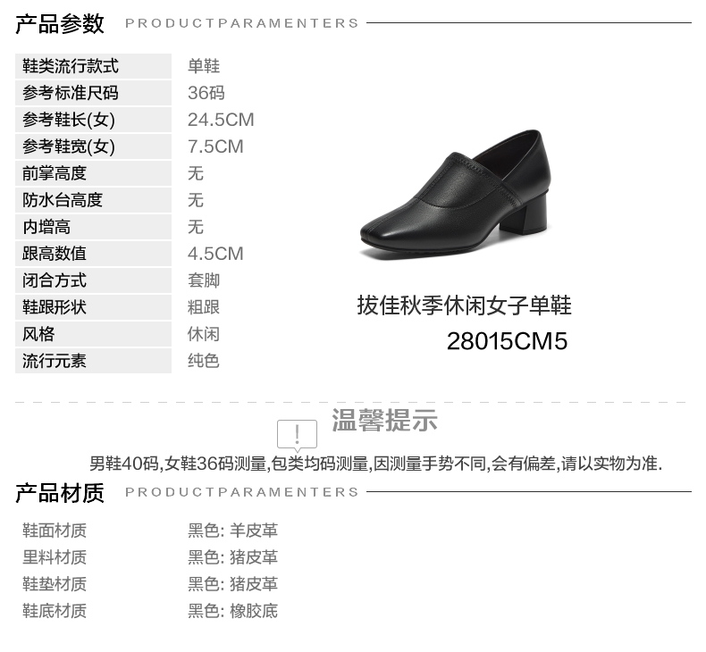 | 鞋面内里材质:猪皮 | 色系:黑色 | 跟高数值:4.5CM | 性别:女子 | 里料材质:猪皮革 |