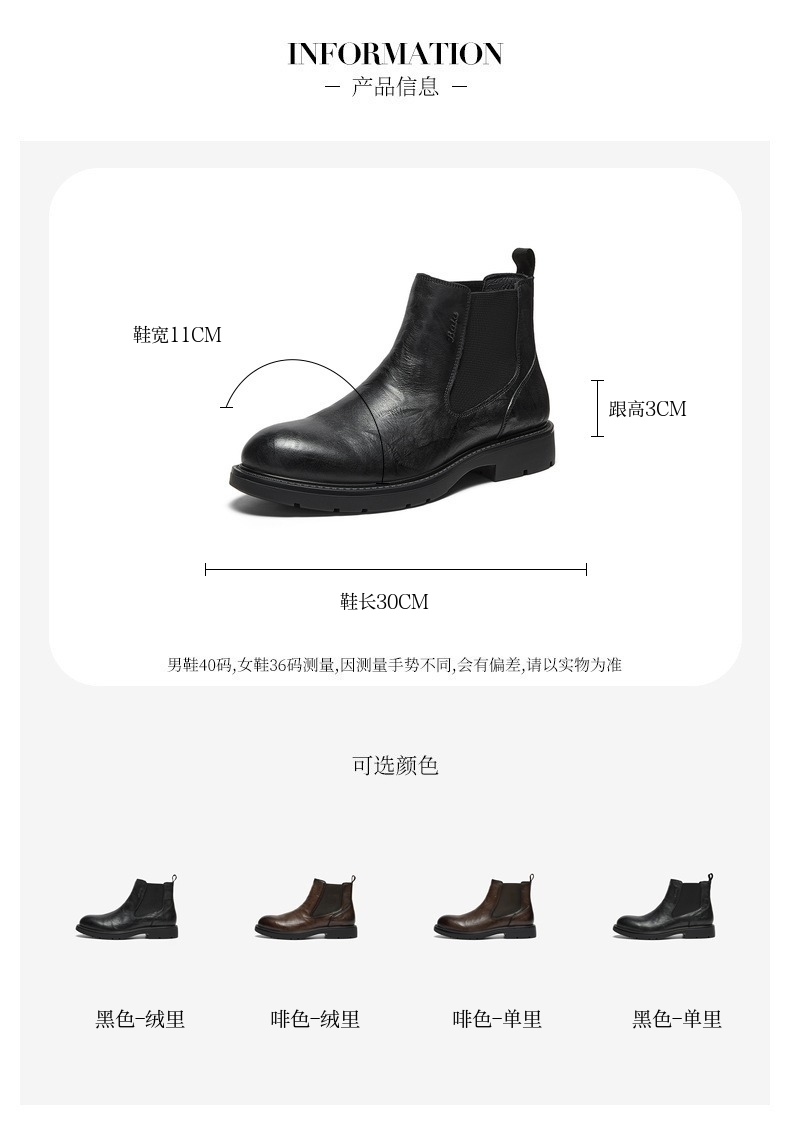 | 闭合方式:套筒 | 40码鞋宽参考(男):11CM | 靴筒口围:27.5CM | 上市时间:2025年冬季 | 鞋类流行款式:切尔西靴 |