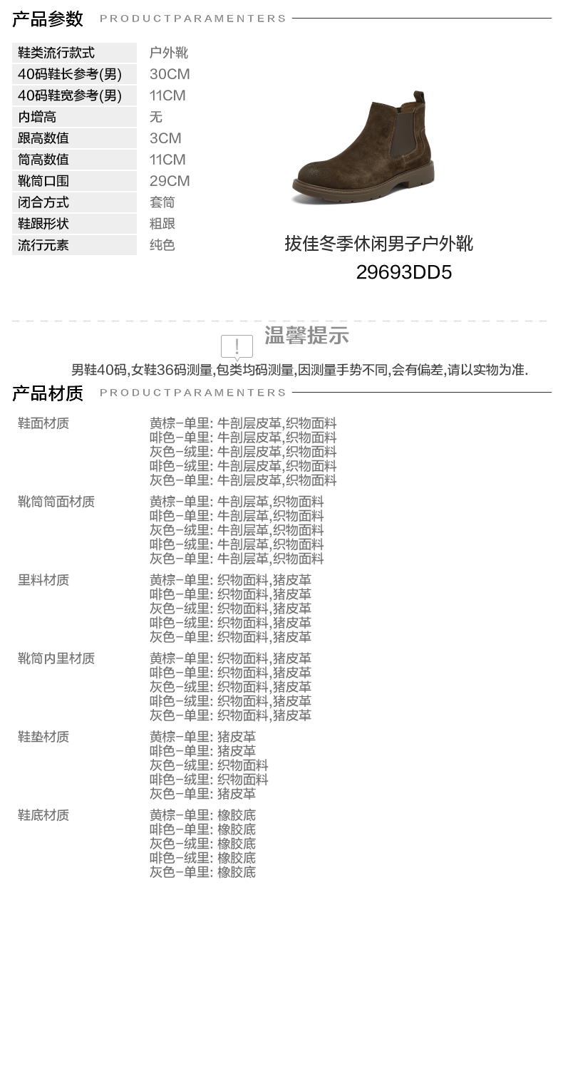 | 40码鞋长参考(男):30CM | 鞋底材质:橡胶底 | 靴筒内里材质:猪皮革织物面料 | 内增高:无 | 鞋面材质:牛剖层皮革织物面料 |