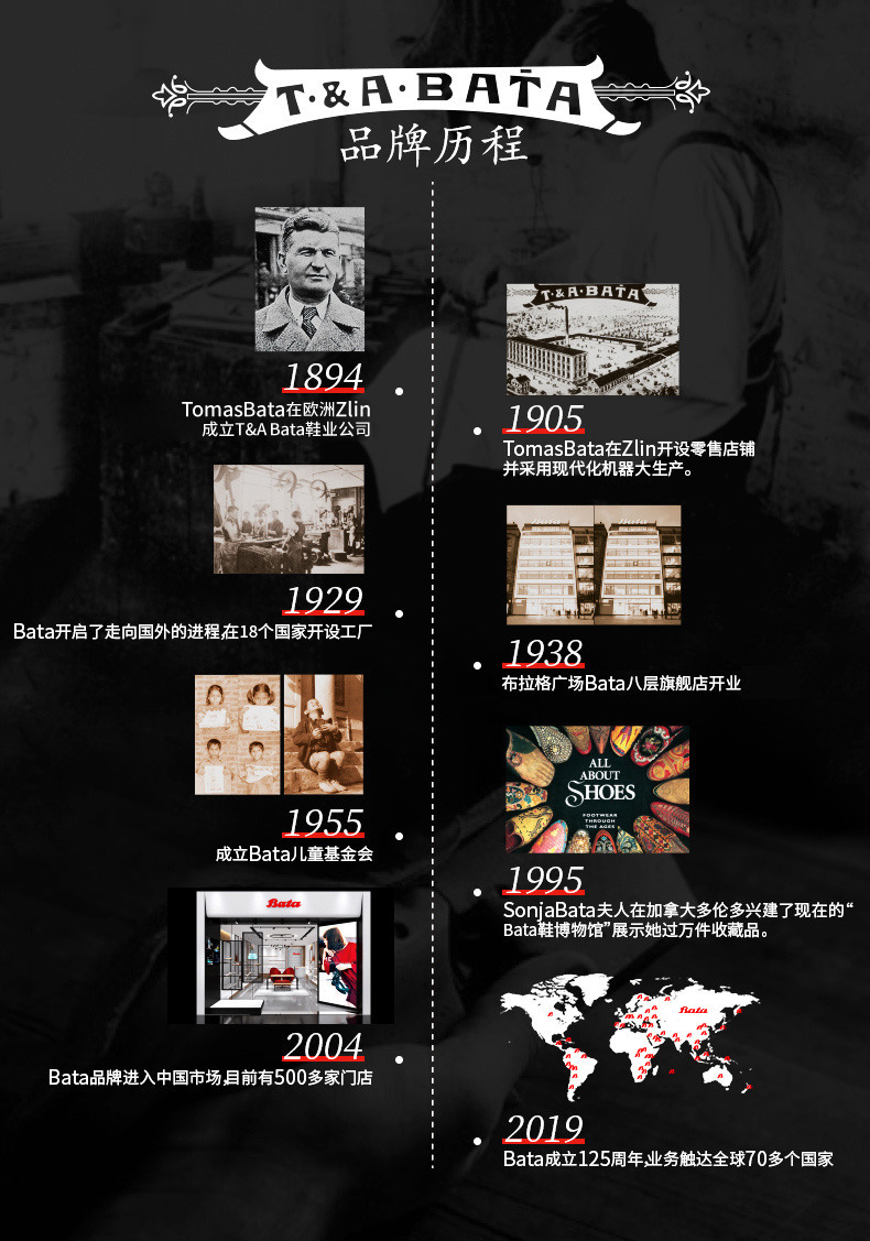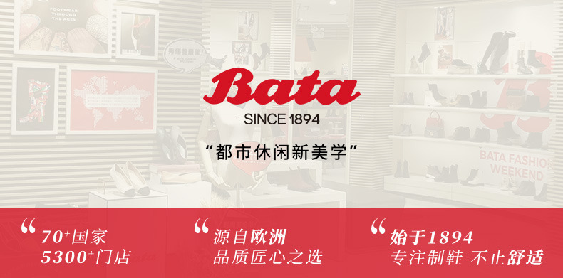 Bata(拔佳),品牌起源于1894年,在捷克的一间手工作坊诞生。品牌理念“我们专注制鞋”,120多年以来,Bata始终秉承百年传统制鞋技术与工艺,致力于为顾客提供舒适的鞋履。