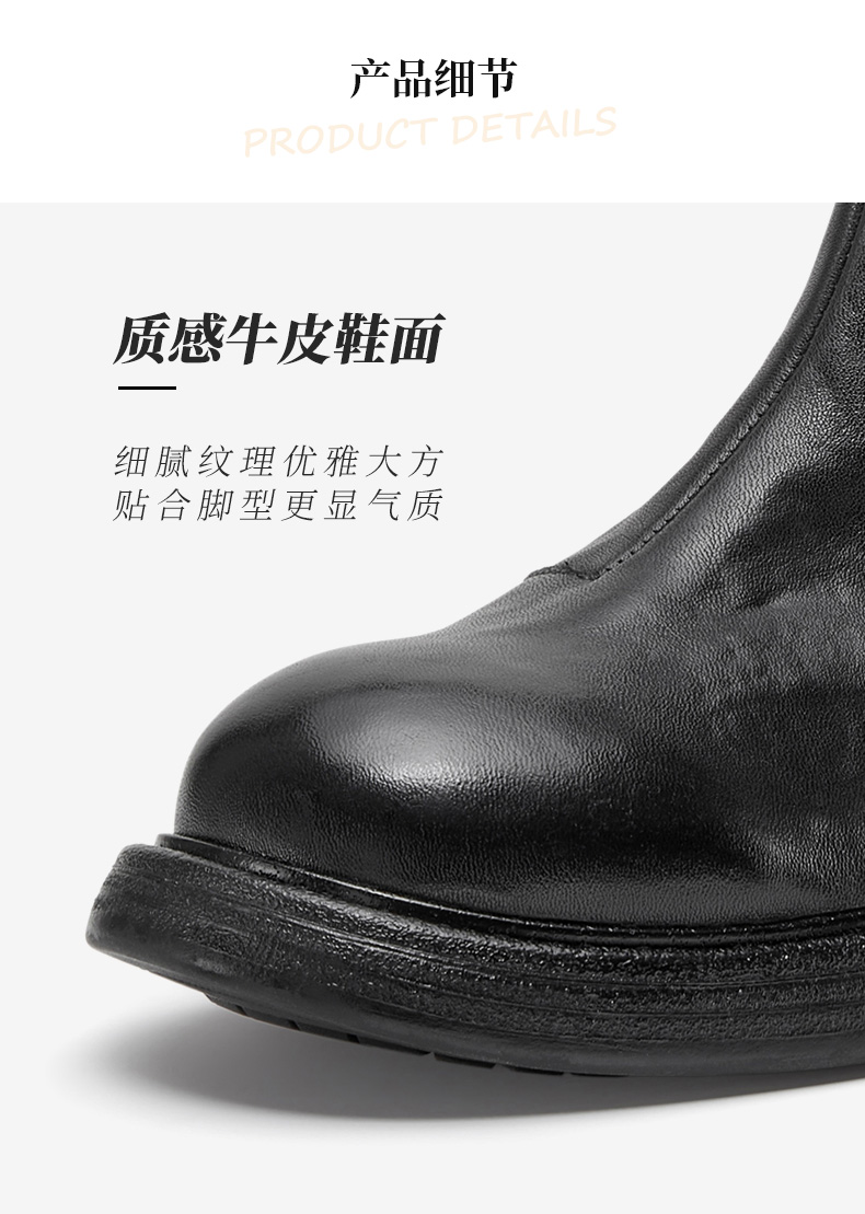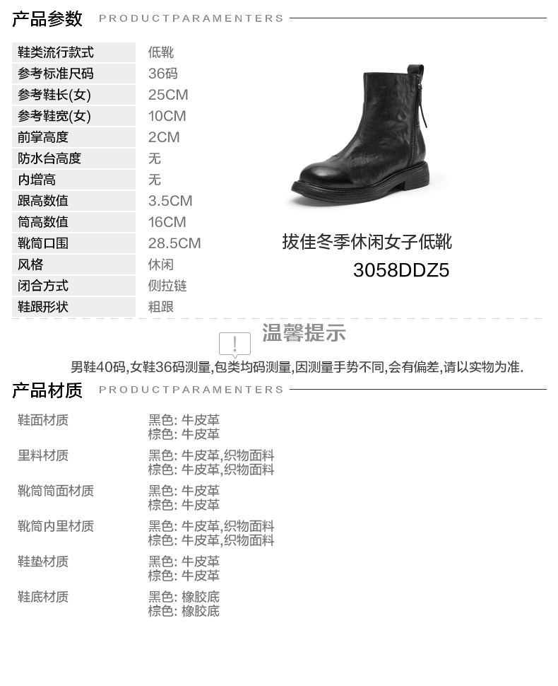 | 鞋底材质:橡胶底 | 靴筒内里材质:牛皮革织物面料 | 内增高:无 | 鞋面材质:牛皮革 | 闭合方式:侧拉链 |
