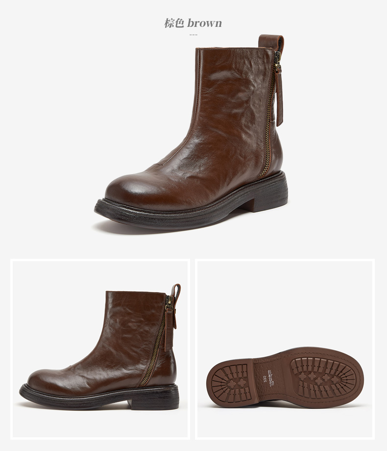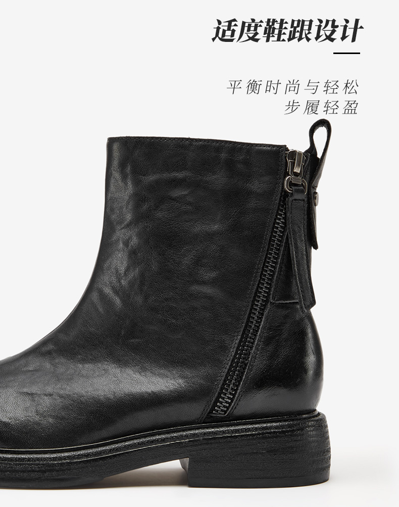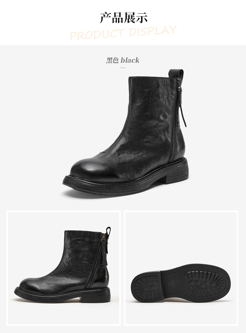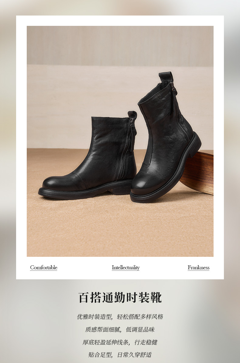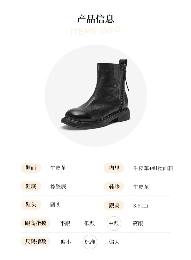 | 鞋底材质:橡胶底 | 靴筒内里材质:牛皮革织物面料 | 内增高:无 | 鞋面材质:牛皮革 | 闭合方式:侧拉链 |