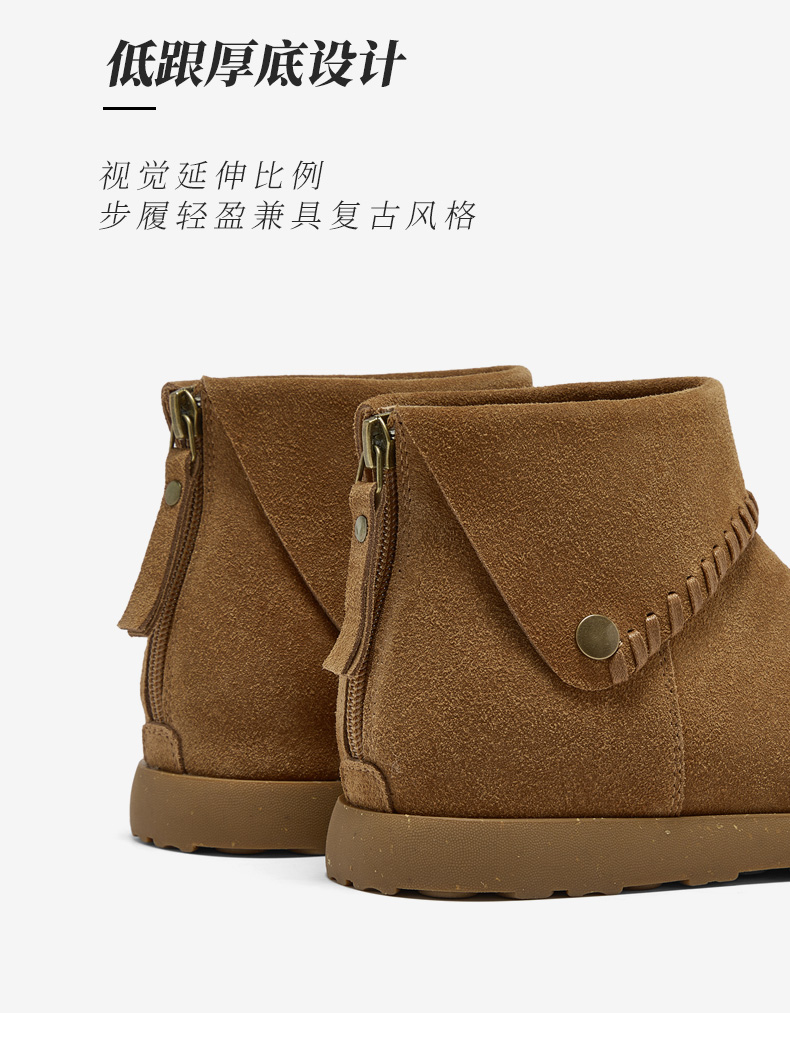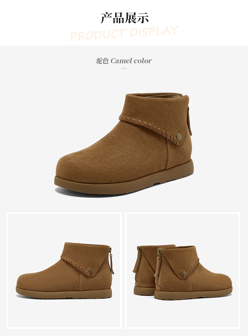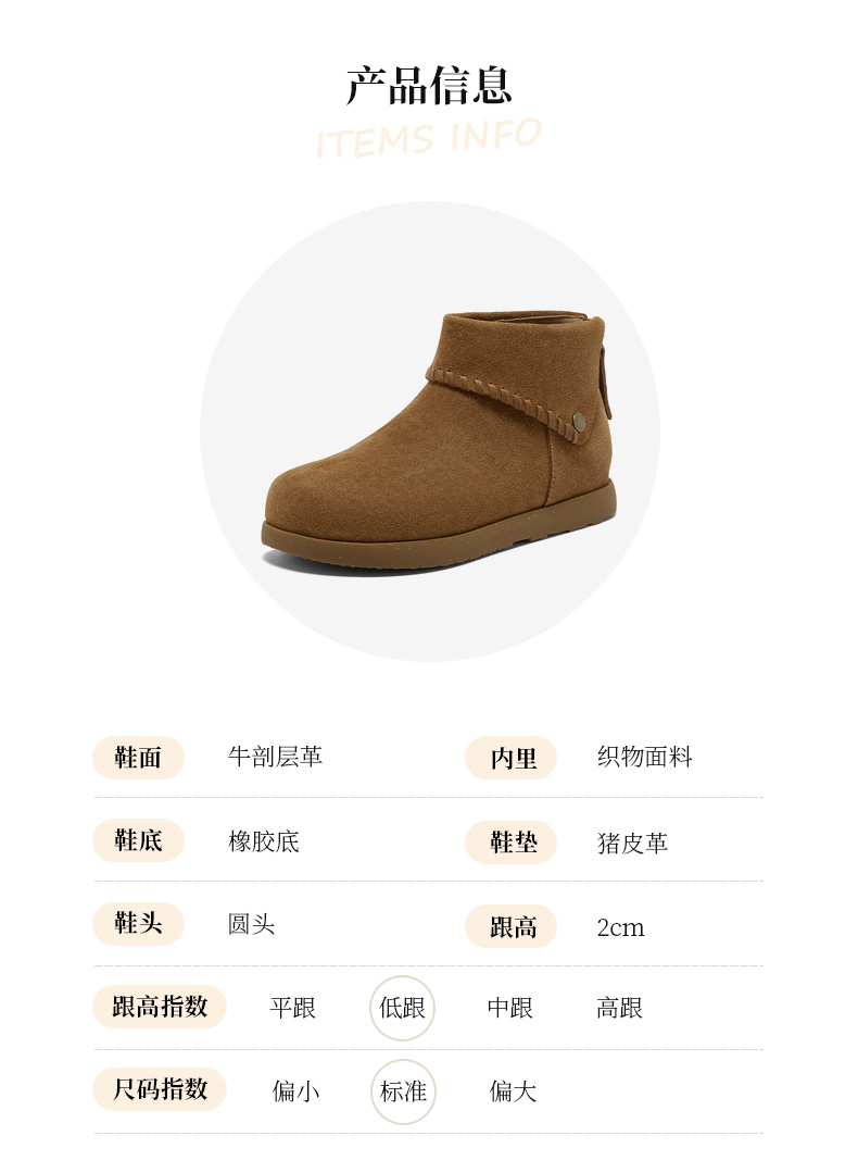 | 鞋底材质:橡胶底 | 靴筒内里材质:织物面料 | 内增高:无 | 鞋面材质:牛剖层革 | 闭合方式:后拉链 |