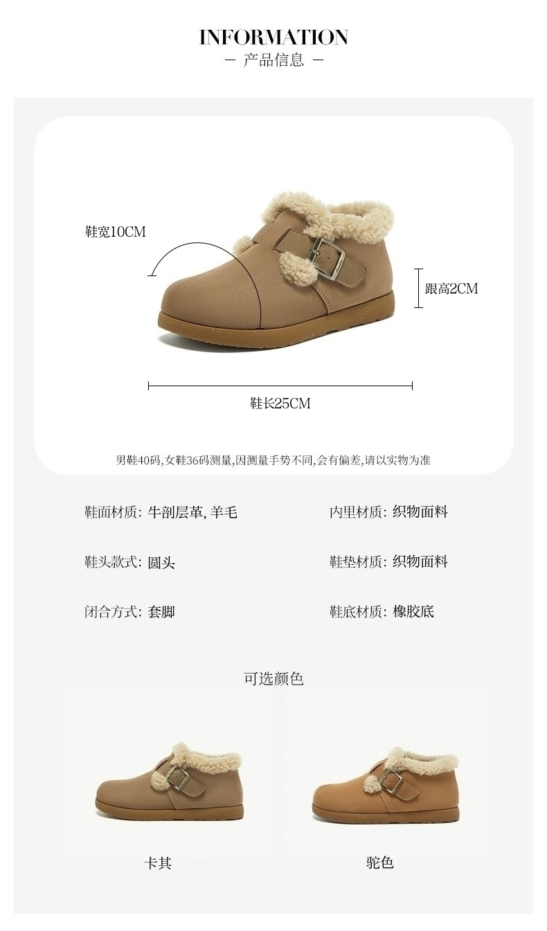 | 鞋垫材质:织物面料 | 款式季节:冬季 | 前掌高度:2CM | 皮质特征:软面皮 | 防水台高度:1CM |