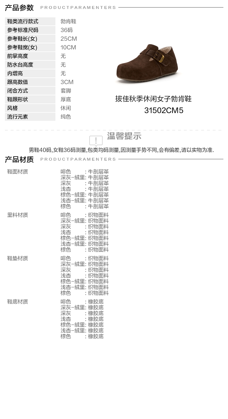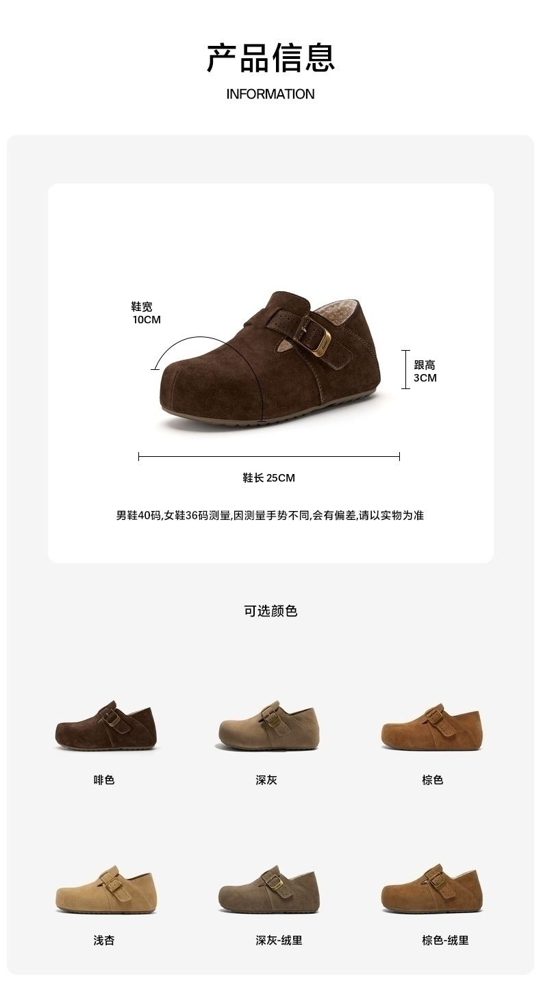 | 配跟:无 | 上市时间:2025年秋季 | 鞋类流行款式:勃肯鞋 | 鞋头款式:圆头 | 鞋面图案:纯色 |