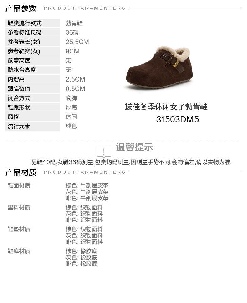 | 配跟:无 | 上市时间:2025年冬季 | 鞋类流行款式:勃肯鞋 | 鞋头款式:圆头 | 鞋面图案:纯色 |